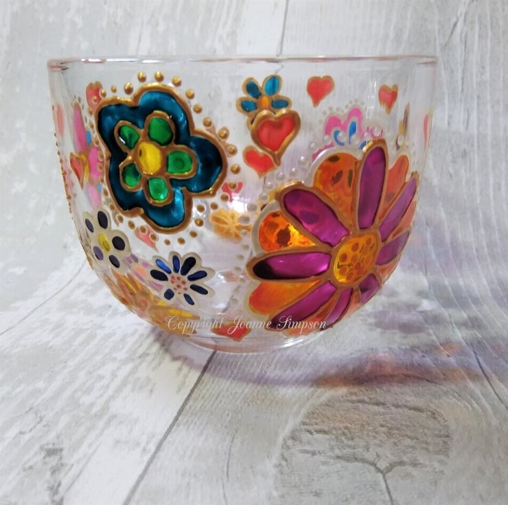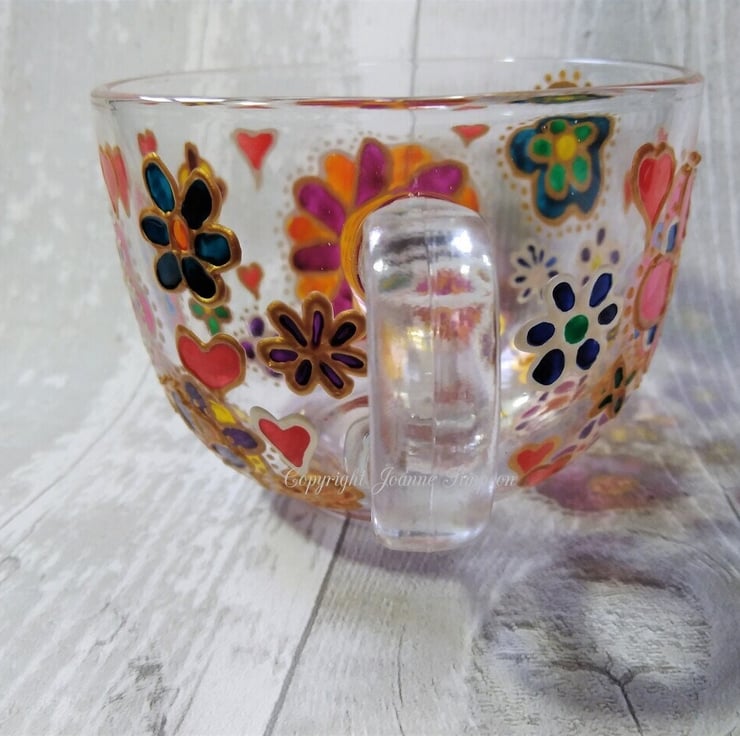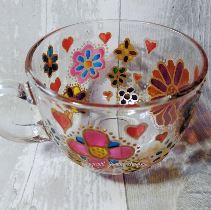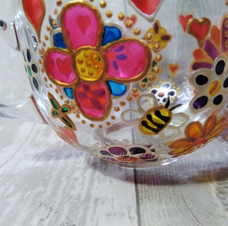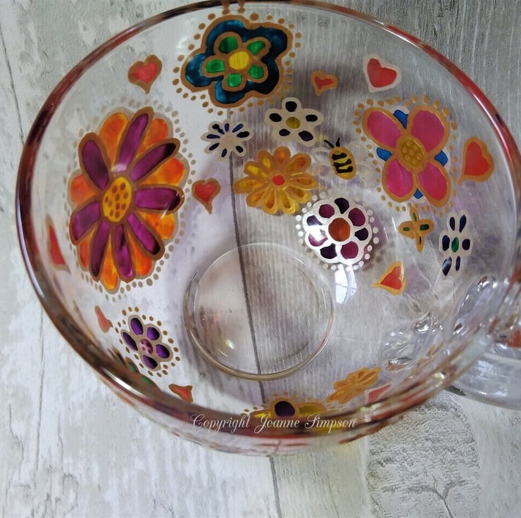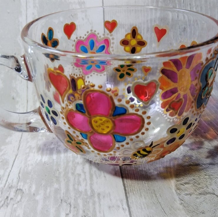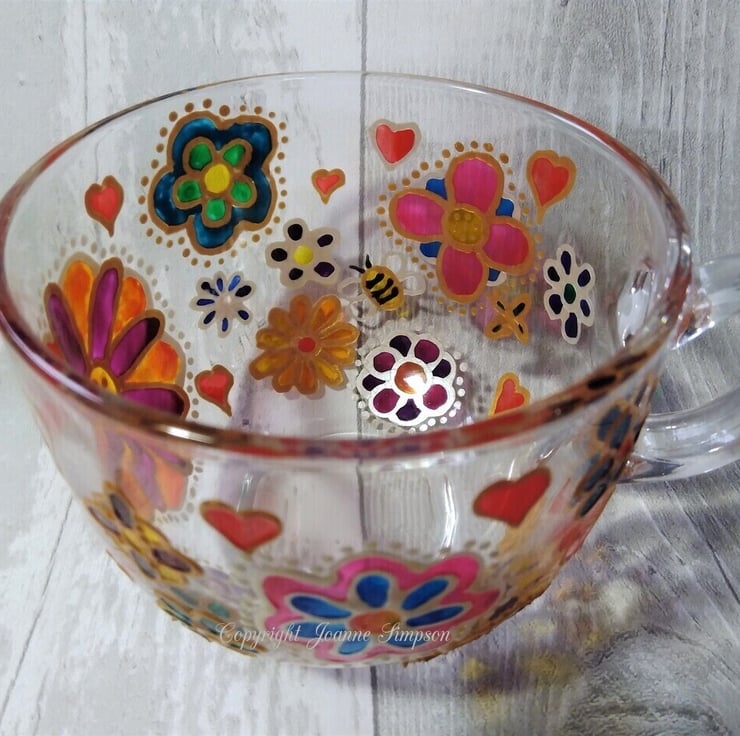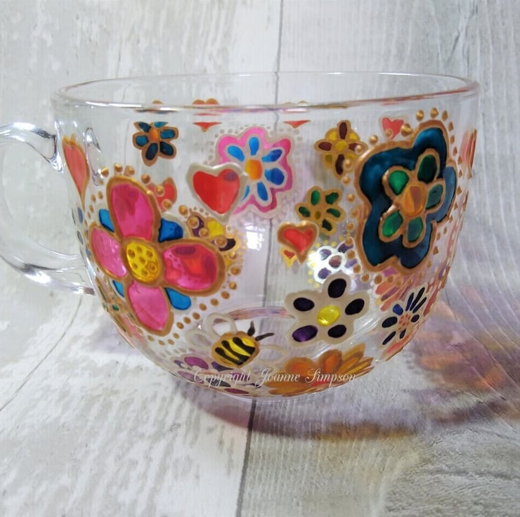 Hand painted large glass mug/cup. A perfect gift for Mother's Day, Valentines Day, Birthday, Anniversary or just to treat yourself. A lovely bright floral mug/cup which is completely unique. Decorated with an array of brightly coloured flowers, and a bee, this is a really fun mug and will brighten anyone's day. A lovely gift for someone special in your life. The paint is heat set so the mug can be used and is not just for decoration. I use glass paints that mimic a stained glass look. The paints are non toxic.