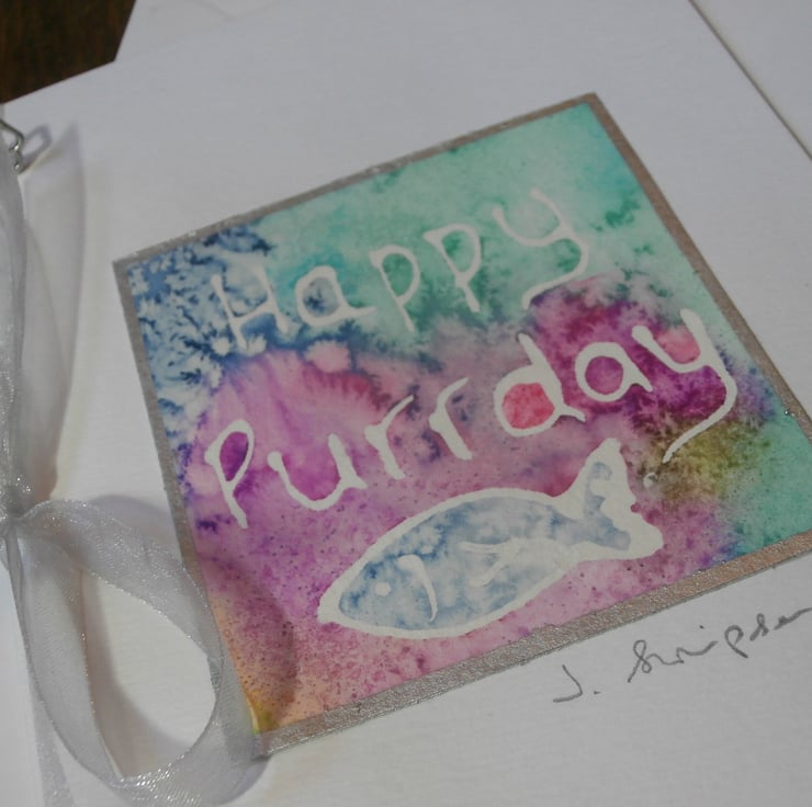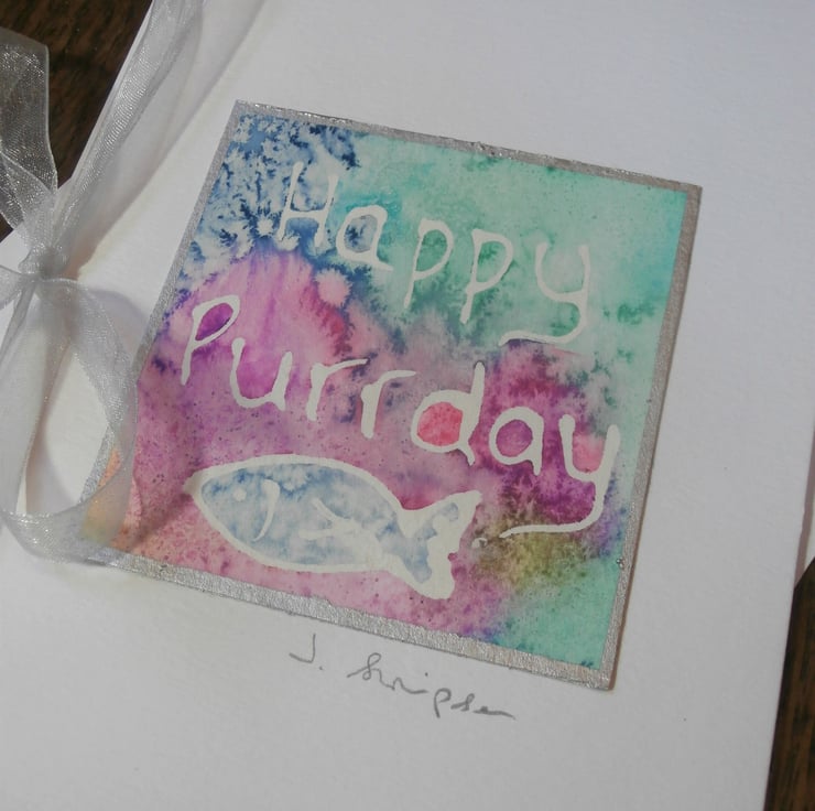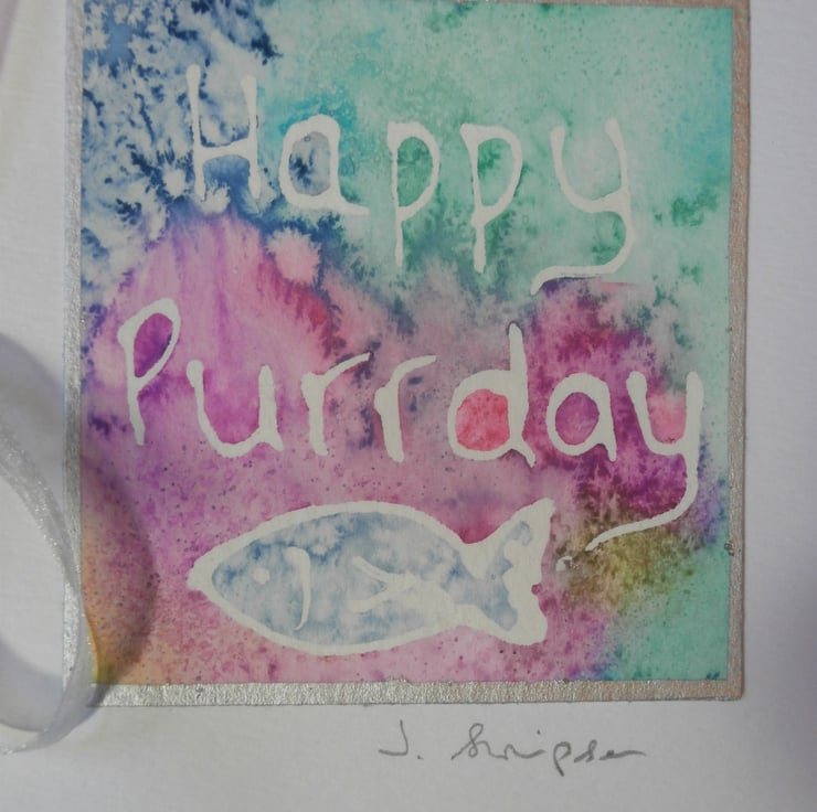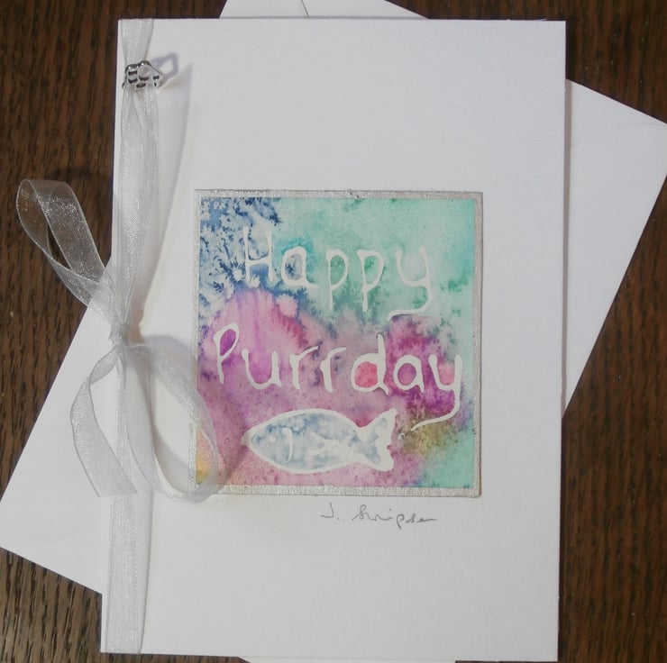 This is a beautiful hand painted watercolour card for your cats Birthday. A totally unique card for your furry friend with the words 'Happy Purrday' in the painting.