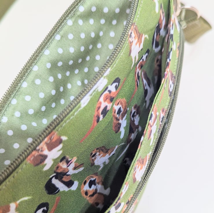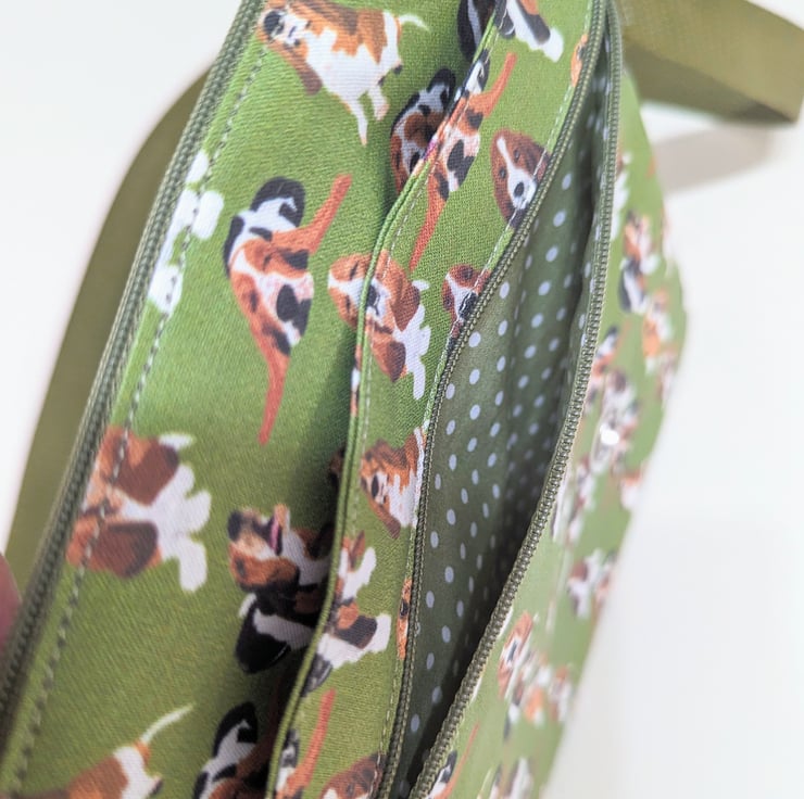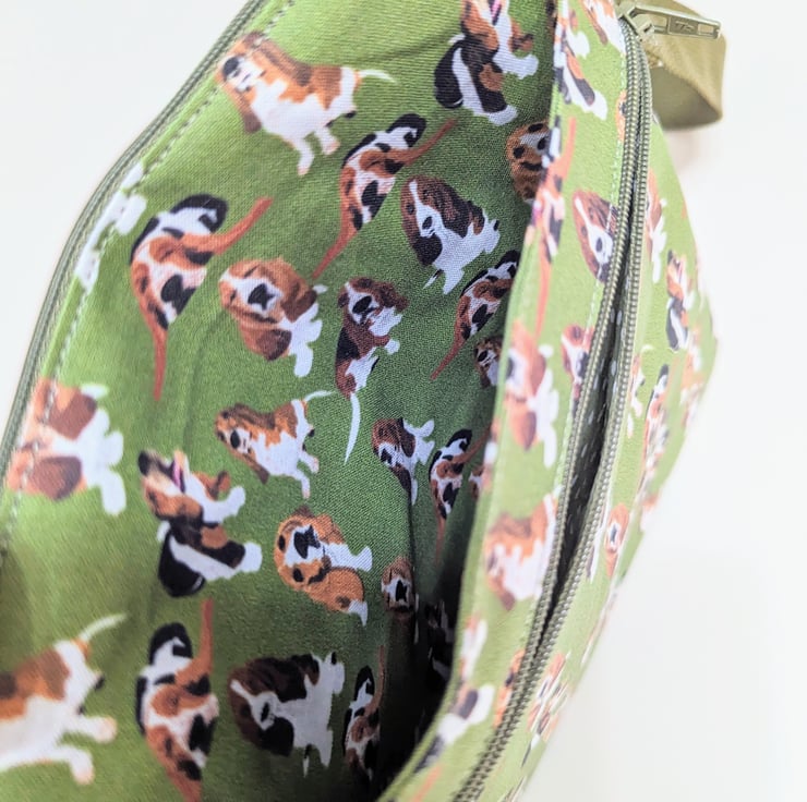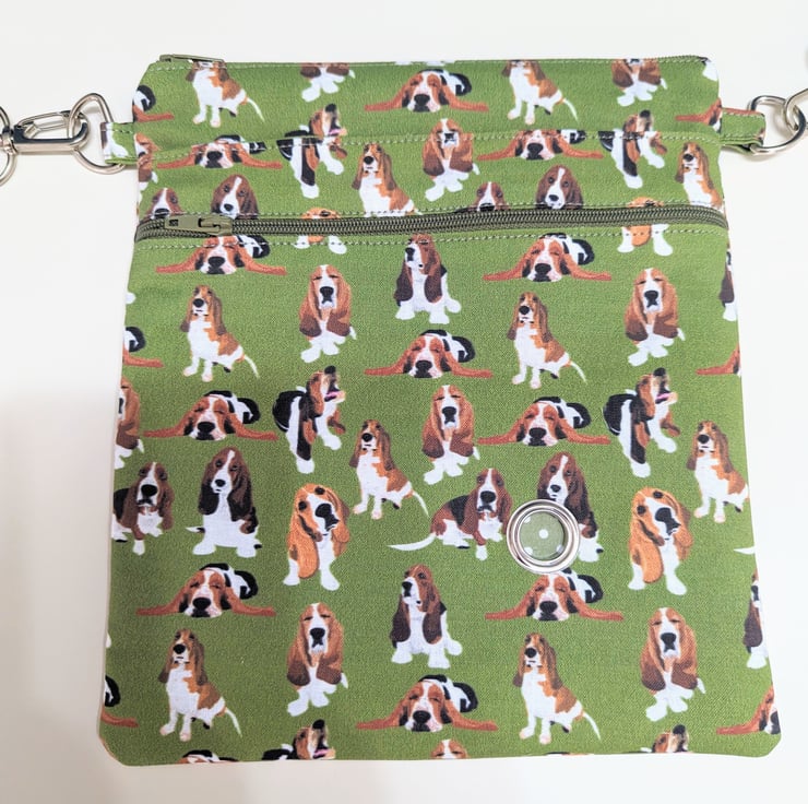 This is a dog walking bag made in a Basset Hound dog fabric