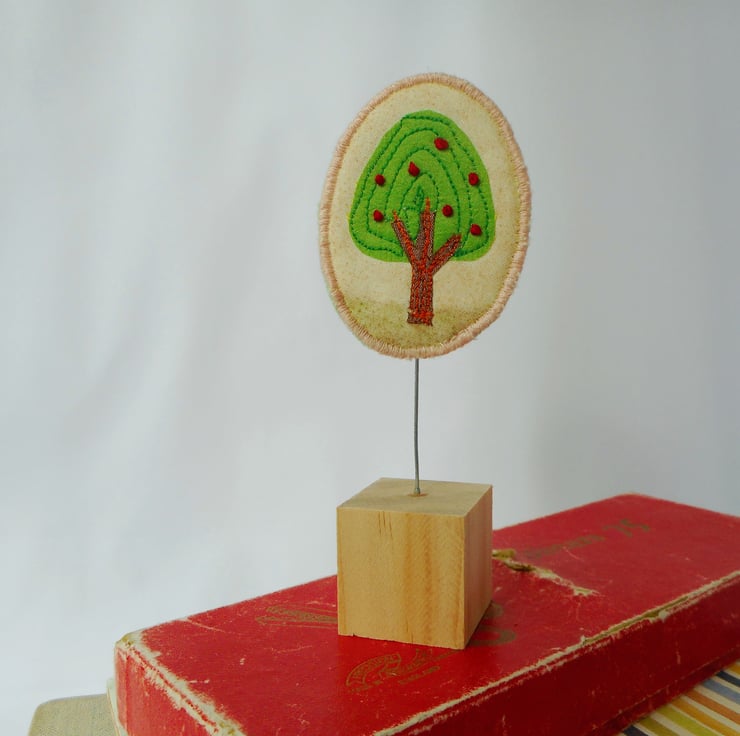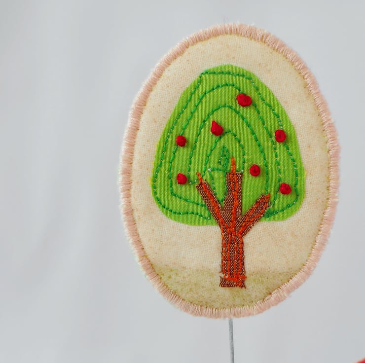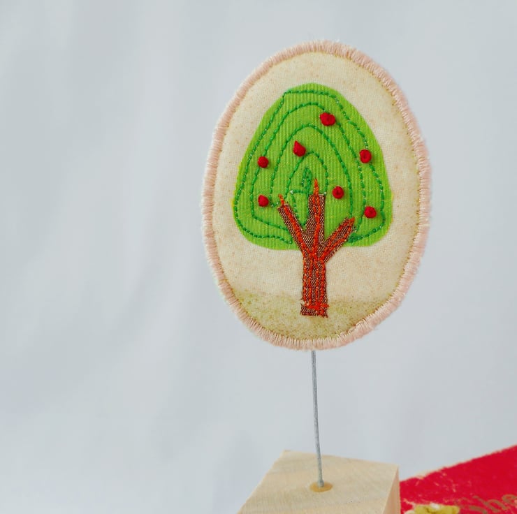 The apple tree decoration is handmade by me, from scraps of dressmaking fabrics. Appliqued onto a cotton backing which I've hand coloured and painted, and then machine embroidered before finally adding hand embroidered details. The front design then has a metal support glued to it before the whole thing is carefully hand stitched onto a felt backing panel to finish.