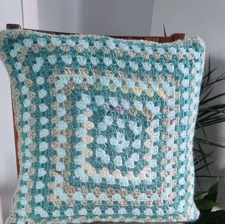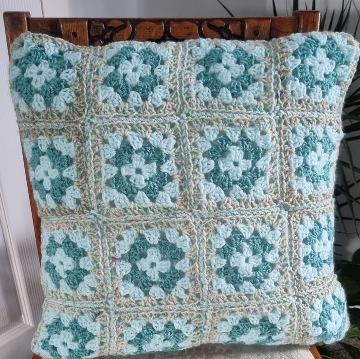 Hand made reversible granny square cushion cover in beige, turquoise and aqua colours