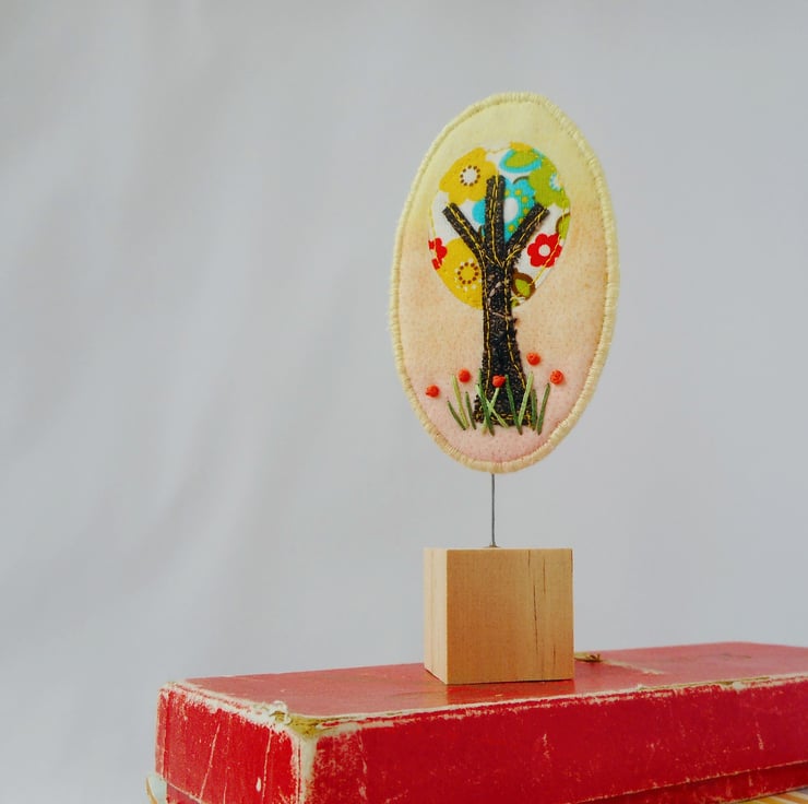 This flowery tree decoration is handmade from scraps of dressmaking fabrics. The design is appliqued onto a cotton backing which I've hand coloured and painted, and then machine embroidered before finally adding hand embroidered details. The front design then has a metal support glued to it before the whole thing is carefully hand stitched onto a felt backing panel to finish.