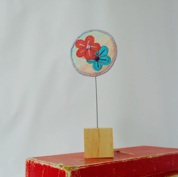 This flower decoration is handmade from scraps of dressmaking fabrics. The design is appliqued onto a cotton backing which I've hand coloured and painted, and then machine embroidered before finally adding hand embroidered details. The front design then has a metal support glued to it before the whole thing is carefully hand stitched onto a felt backing panel to finish.