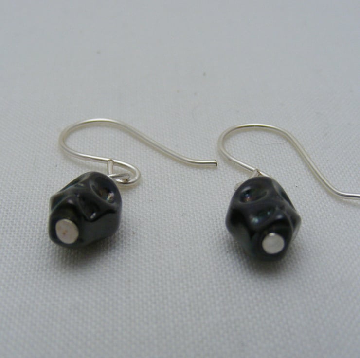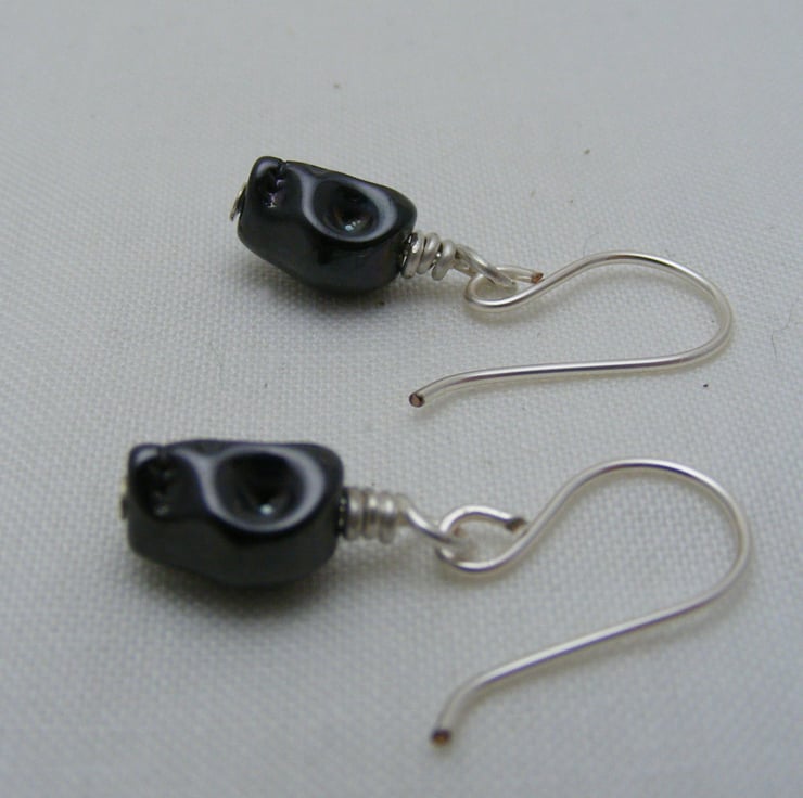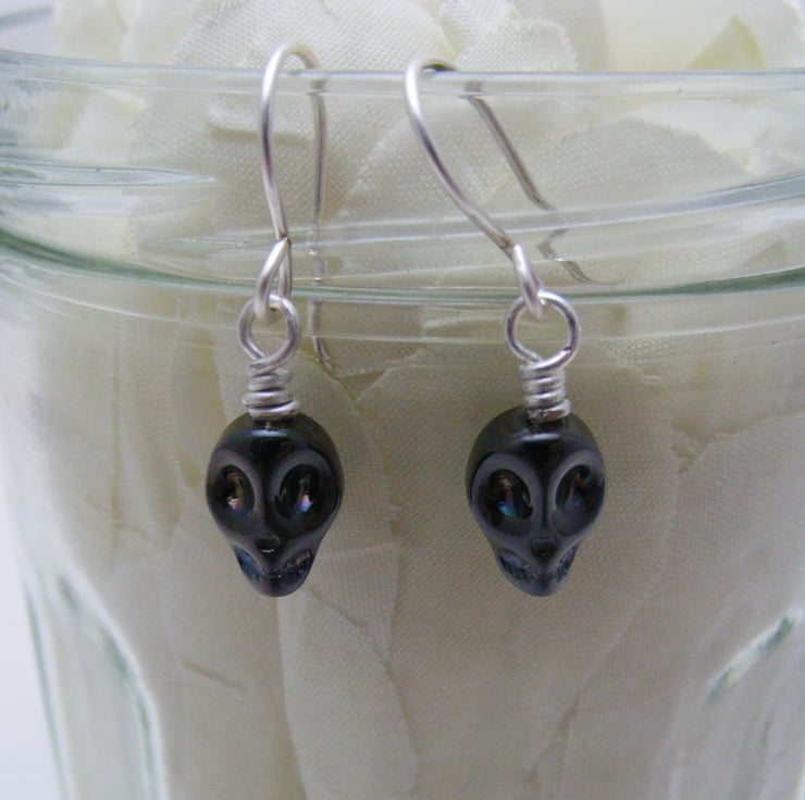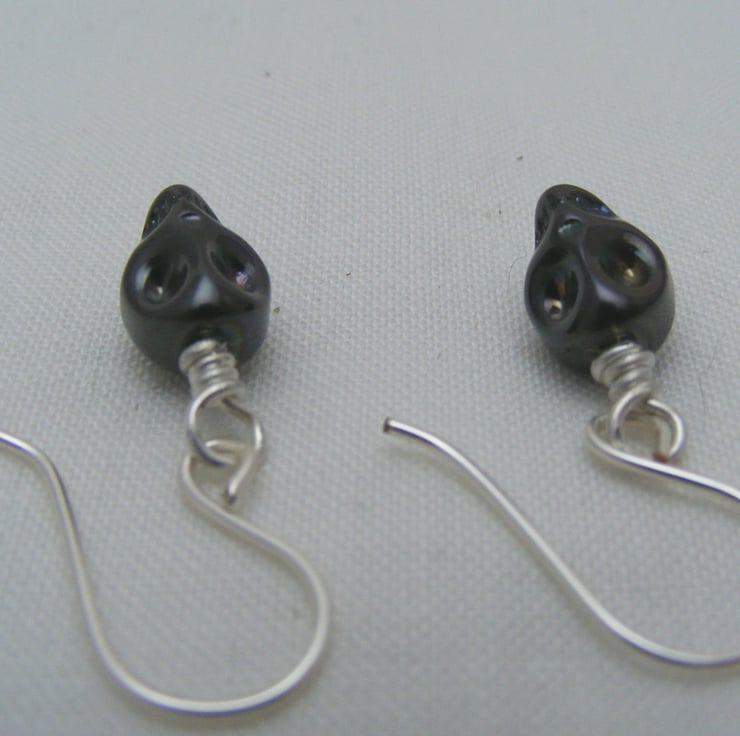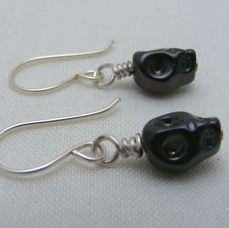 These earrings are handmade with, 10x7mm Metallic black glass skull beads which are wrapped on silver plated headpins and have handmade silver plated hypo allergenic ear wires attached.