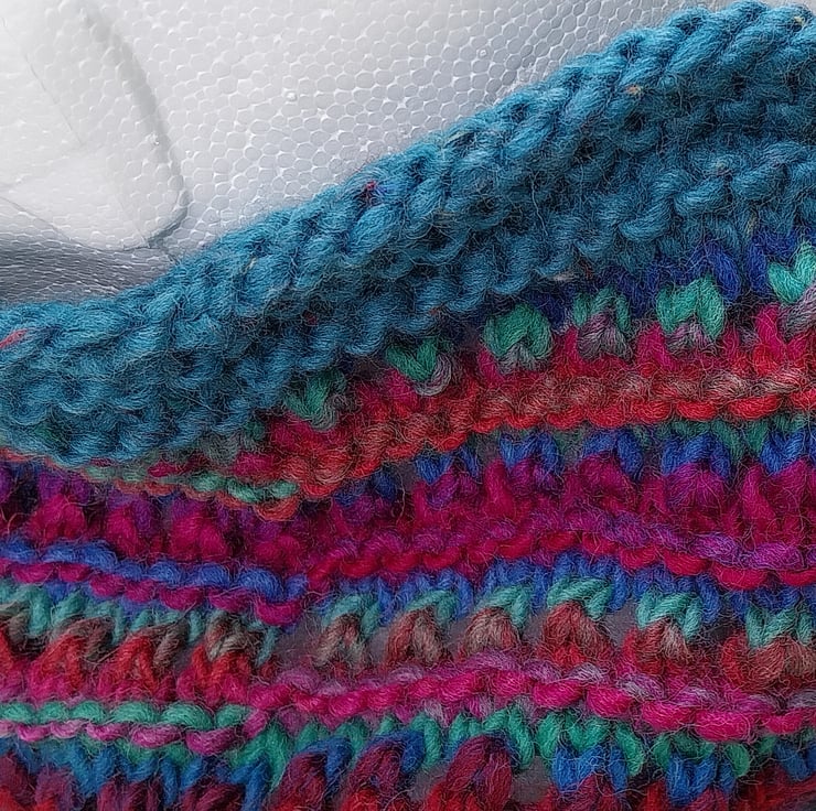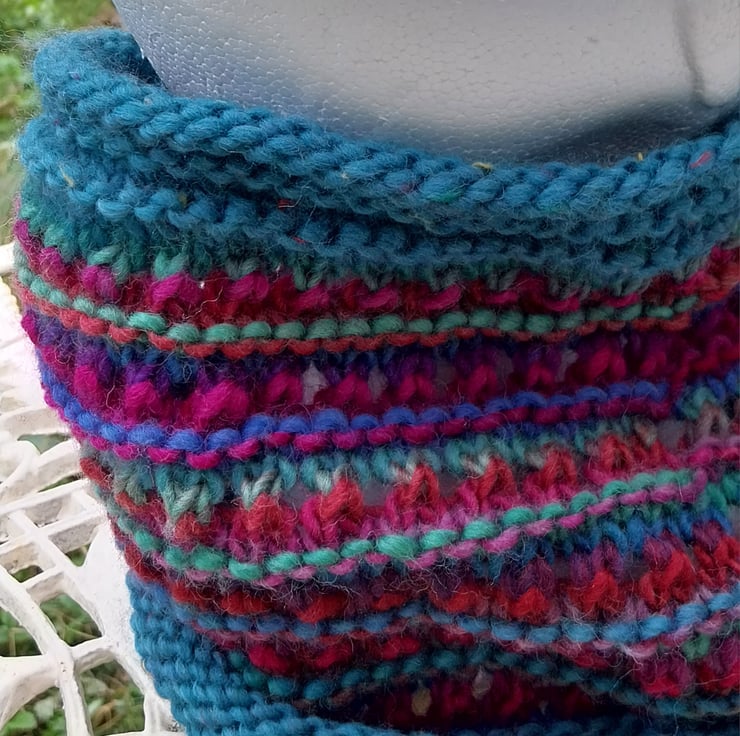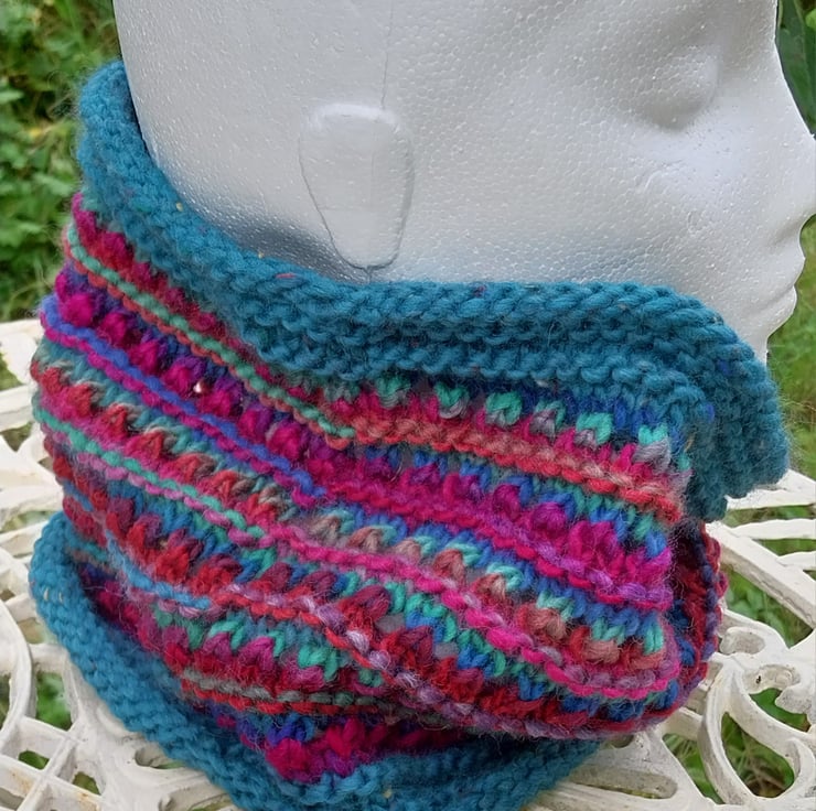 Handknit chunky wool circular cowl col 5 with Teal contrast