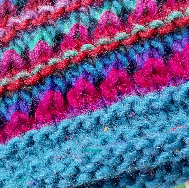 This cowl is multicoloured with contrast edges. It features a textured eyelet pattern and it made from a lovely, self striping 100% Wool with a gorgeous set of colours.