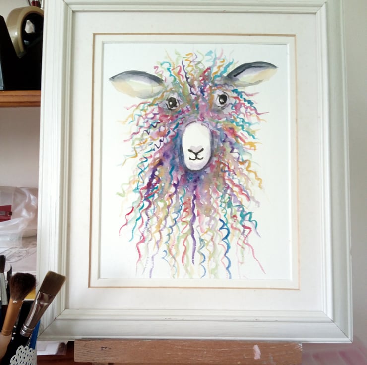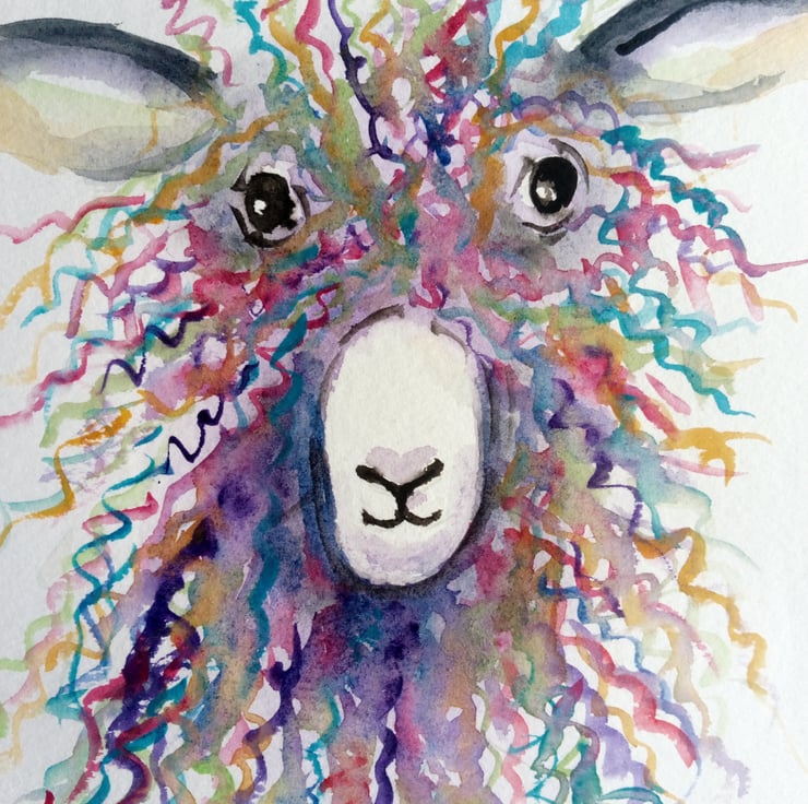 A curly rainbow haired sheep original watercolour painting by marjansart.