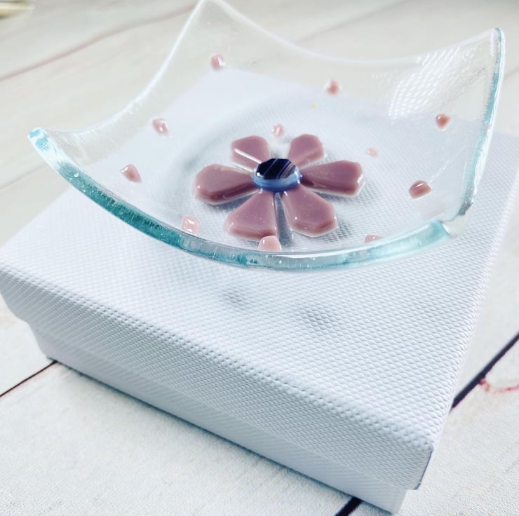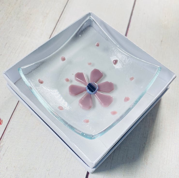 Pretty fused glass trinket dish which comes presented in a white gift box . Both pretty and functional . Perfect small gift . Approximately 3.5 inches square it’s the perfect size for small jewellry items or just a pretty little ornament.