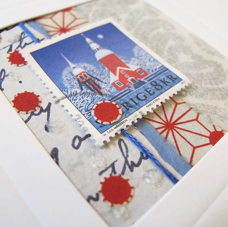 A beautiful and unusual hand made christmas or winter card, collaged with a selection of vintage, printed and handmade papers and a genuine winter themed postage stamp. This unique card has been hand embossed around the frame, and has been left blank for your own personal message.