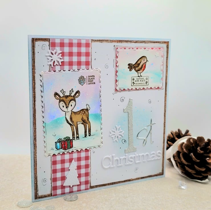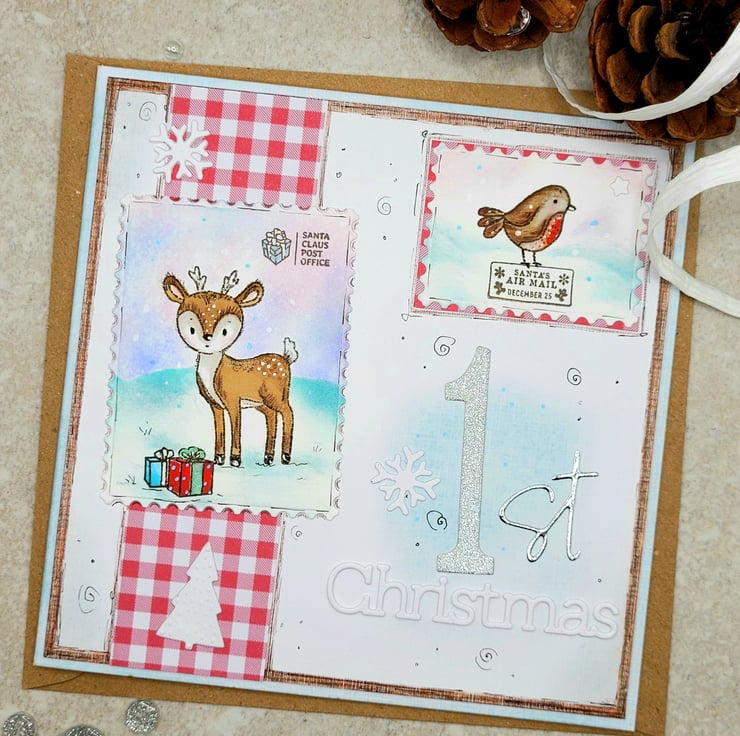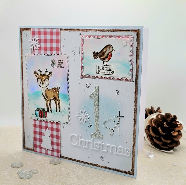 Baby's 1st Christmas card. How special is a little one's first christmas! This adorable handmade card with a tiny deer and a chubby robin, is a perfect way to mark this special occasion. A lovely one of a kind, hand-crafted card, which can be kept in a baby's memory box as a little keepsake.