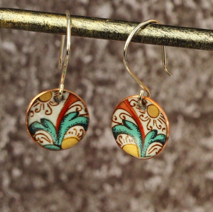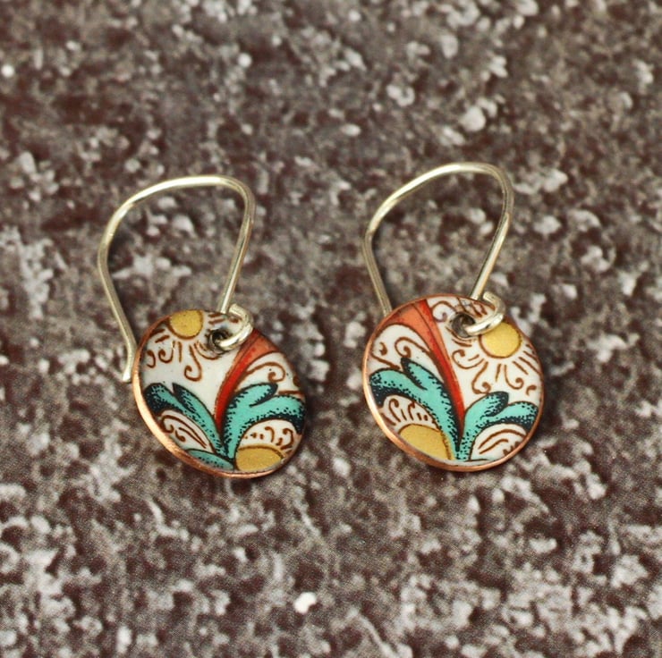 Enamelled copper disk earrings, decorated with an elaborate patter on an ivory background. Each disk is slightly concave, measures 13mm in diameter and has a natural copper finish on the back. The earring wires are handmade from sterling silver