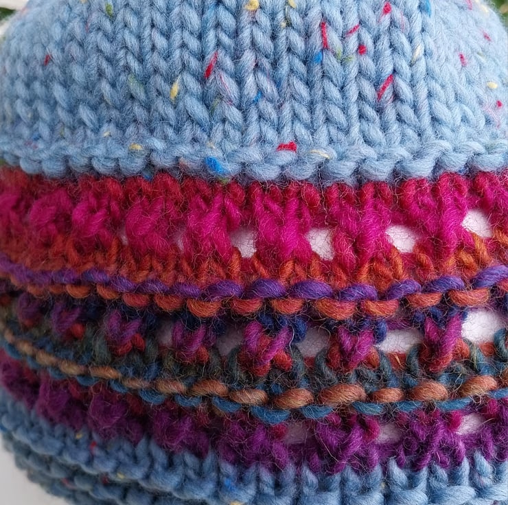This hat incorporates an eyelet pattern design and the hat is a plain colour with bright rainbow colourwave as a decorative band.