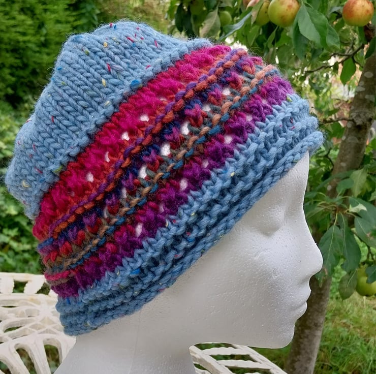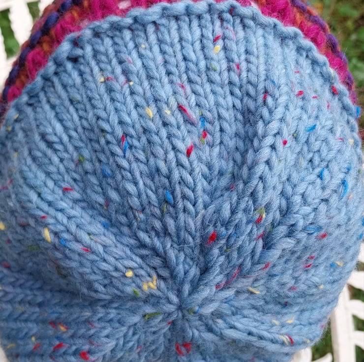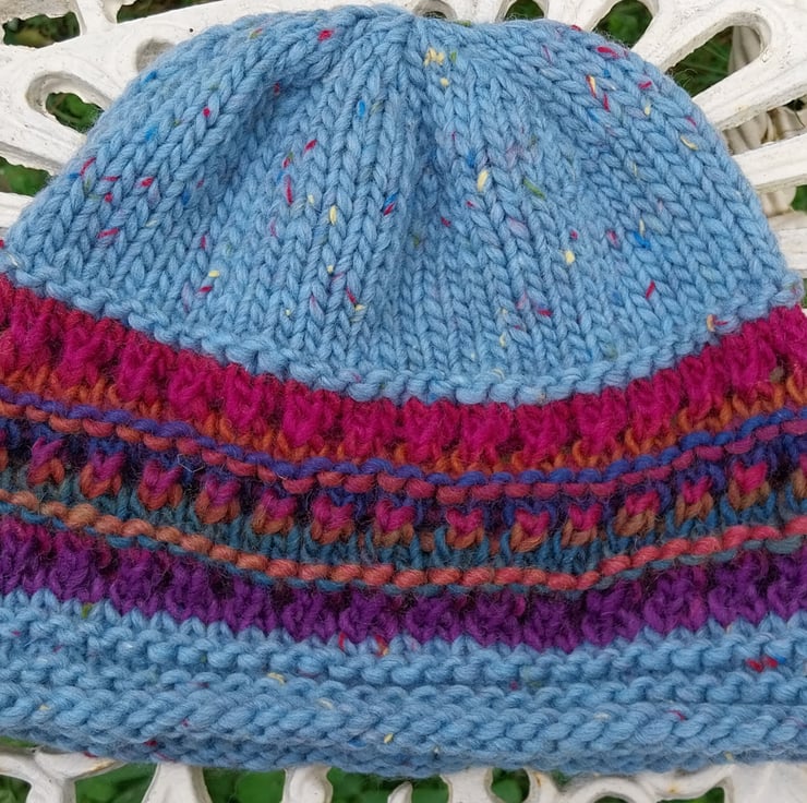 This hat is made from a gorgeous, soft, tweedy, chunky merino from Sublime and a multicoloured 100% Wool contrast.