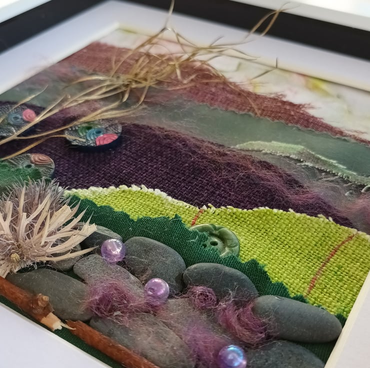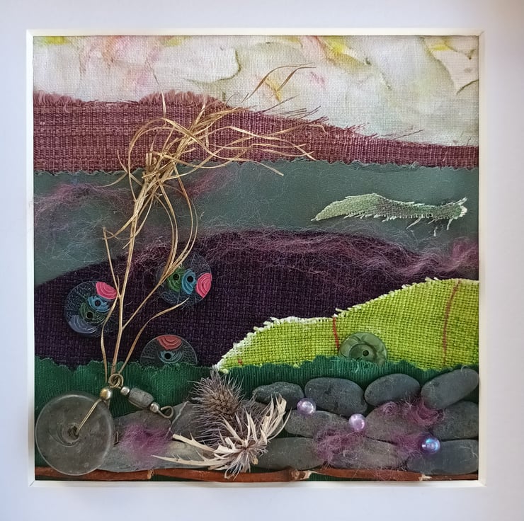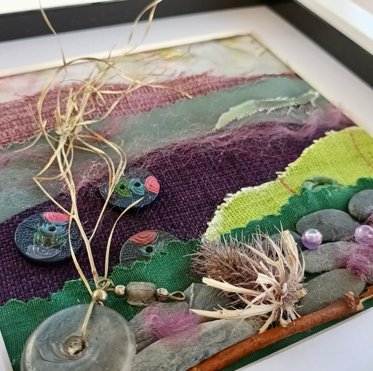 The dry stone wall is made with small pebbles from the beach, there's a dried thistle, and vintage buttons all mounted on remnant fabrics