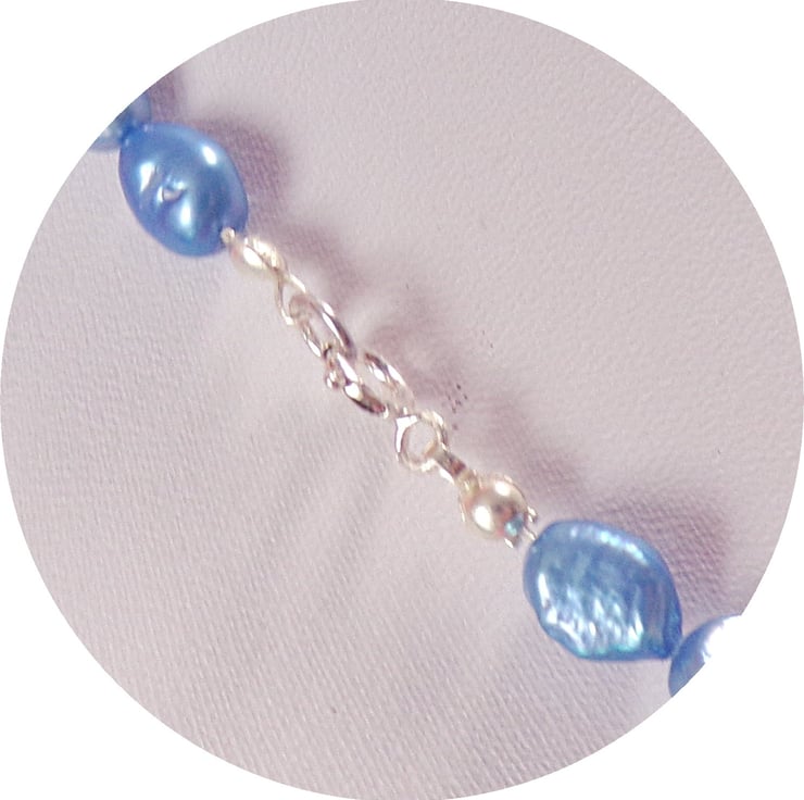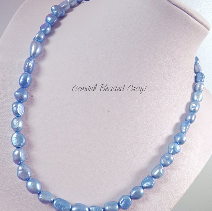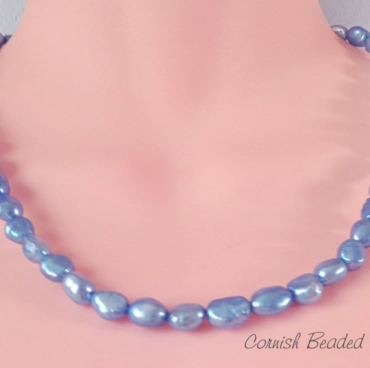 This is a Handmade Beaded Necklace. It's Made With Blue Natural Freshwater Rice Pearl & Sterling Silver Clasp Necklace.