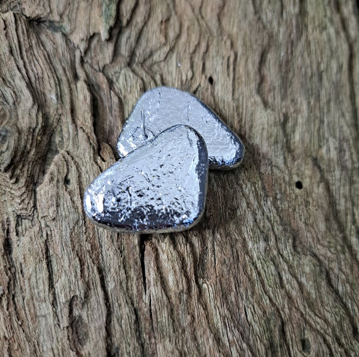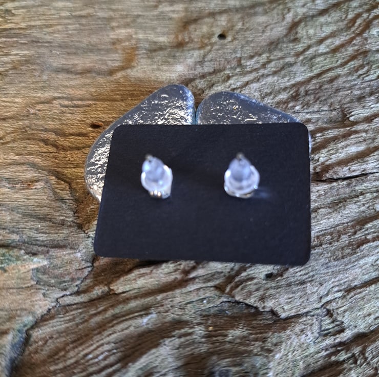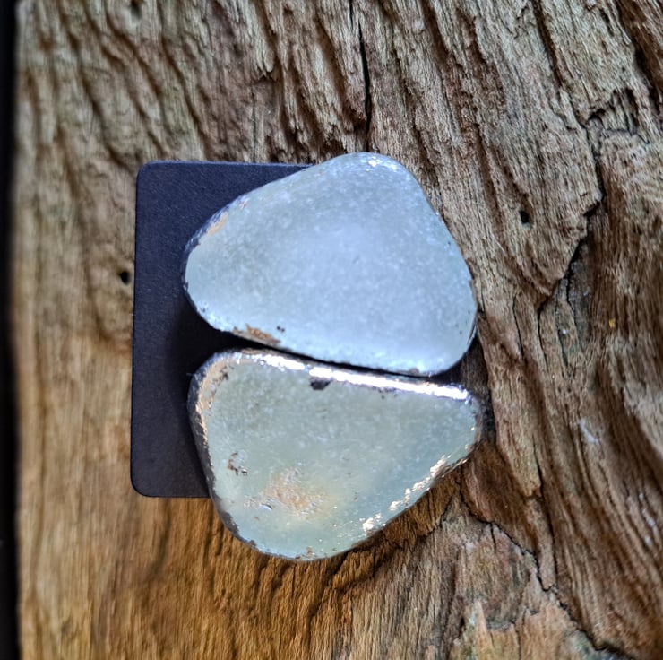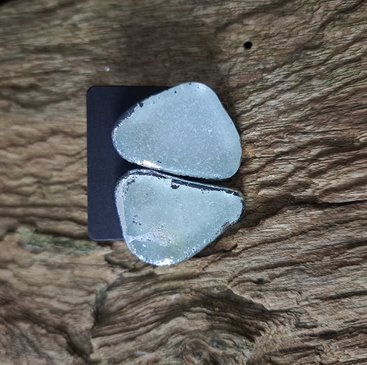 A beautiful pair of silver leaf sea glass stud earrings. The sea glass was lovingly sourced from the Kent coast. This has been attached to stud posts and silver leaf has been added to give that extra sparkle. These have been coated to protect and enhance shine. Two backs are provided for you to choose from, these are butterfly back and plastic.