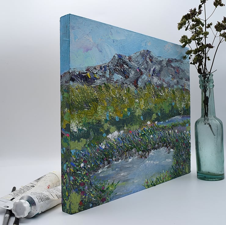 I have applied thick layers of acrylic paint on to a board using brushes, a knife and various mark making tools. The mountains have been painted in cool colours to give a sense of wilderness and distance. I've used a palette knife for this part of the work, ensuring that the layers join and overlap seamlessly. The middle section has been painted using a variety of brushes to depict grasslands leading down to small lochans. I have used, needles and twigs to apply paint around the water to suggest the range of flowers and grasses that thrive near water.
