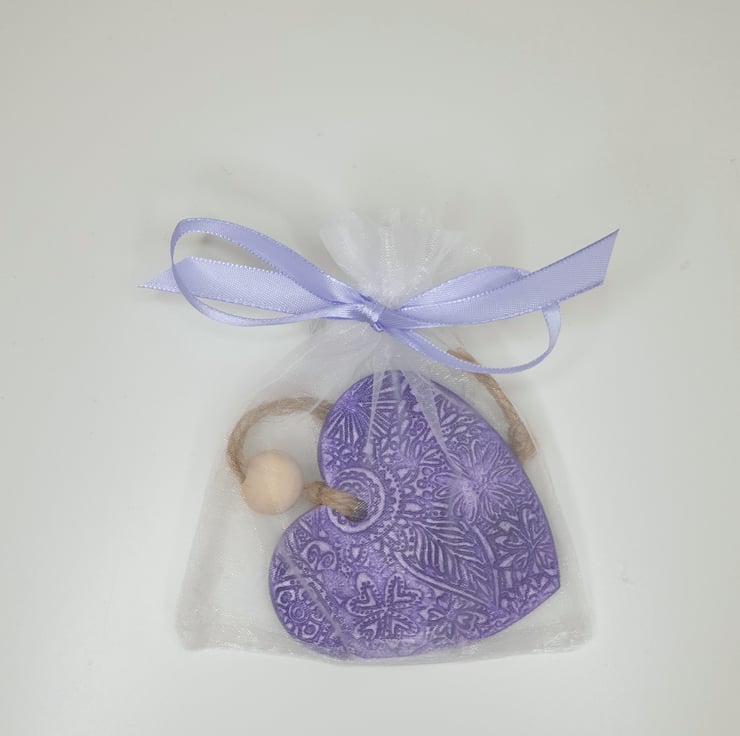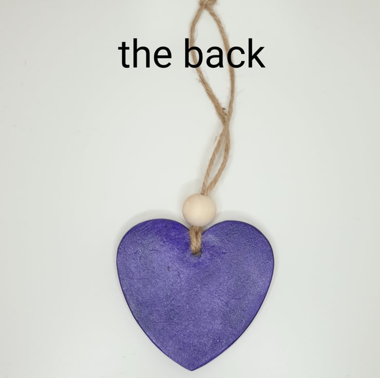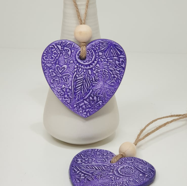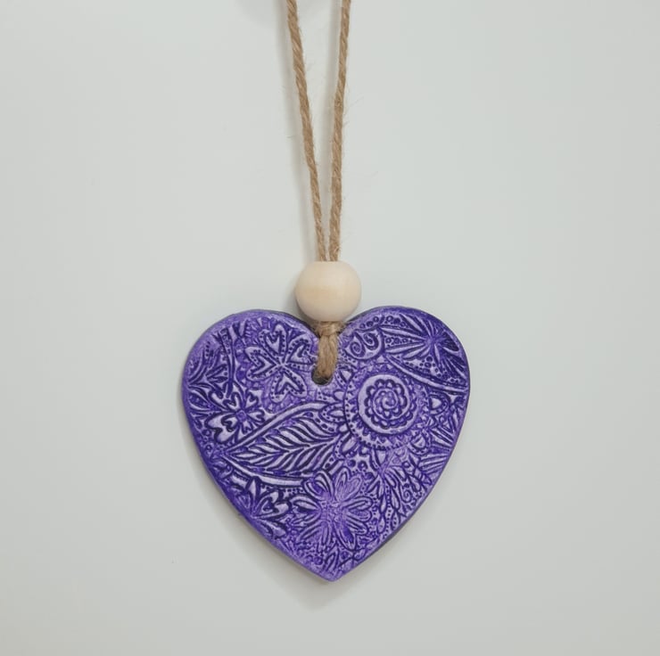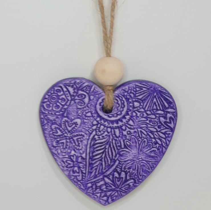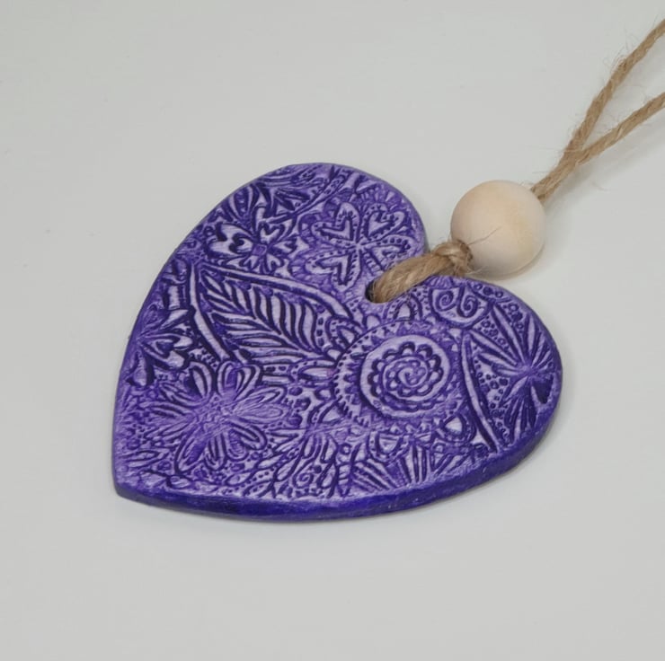 Pretty purple heart hanging decoration lovingly created from air dry clay and embossed with a floral pattern on the front whilst the back has been left smooth. The heart has been painted with purple acrylic and finished with internal varnish.