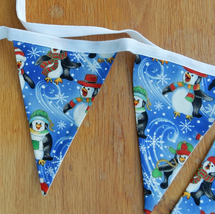 This gorgeous Christmas bunting has 12 flags, made from cotton fabric featuring jolly penguins in hats, scarves and ear warmers, and a generous sprinkling of snowflakes. The flags have a plain cream fabric on the reverse, which gives a quality feel and helps the bunting hang well. The white tape measures approx. 2.5 metres, with the distance between first and last flag being 169 cm. This gives a generous length of bunting, with ties at each end for hanging. Each of the 12 flags is 16cm (6.5 inches) deep.