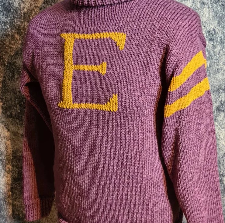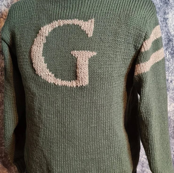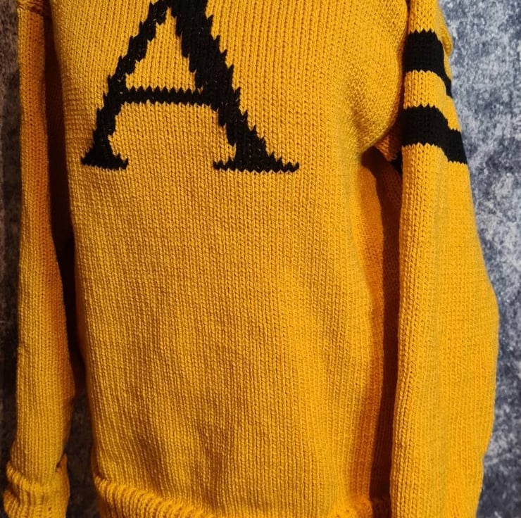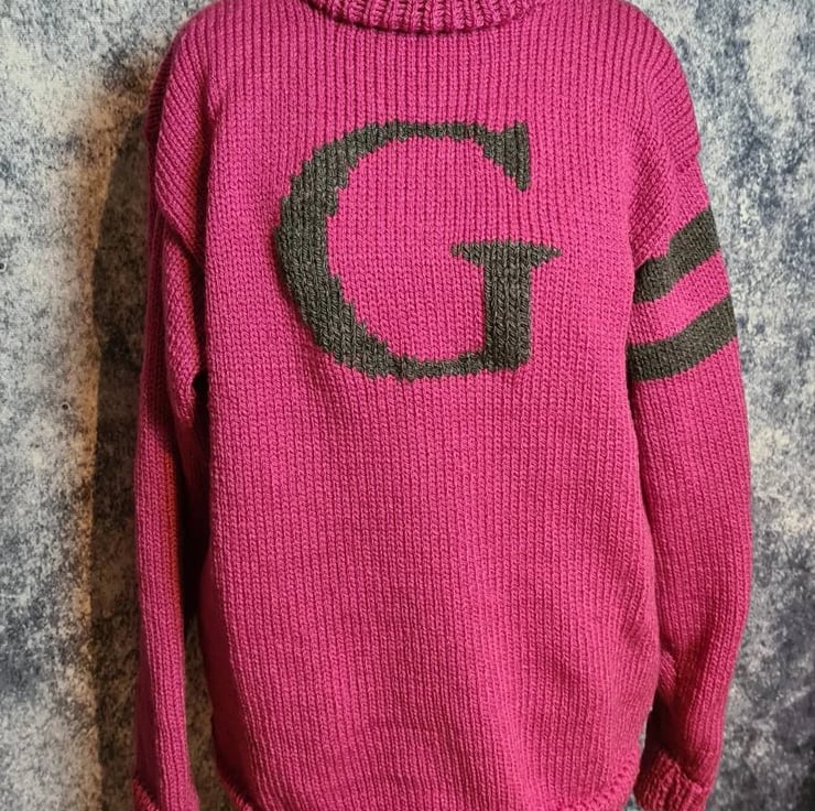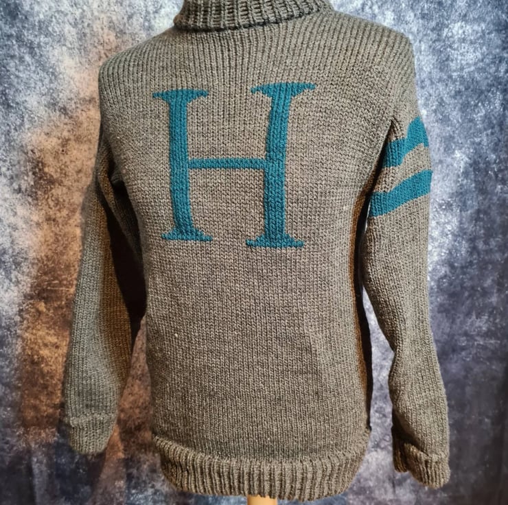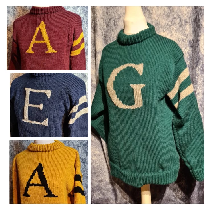 A custom made, hand made jumper with the initial of your choice. Available in any colours you would like, just send me a message with the main colour, and the contrasting colour for initial and stripes on the arms.