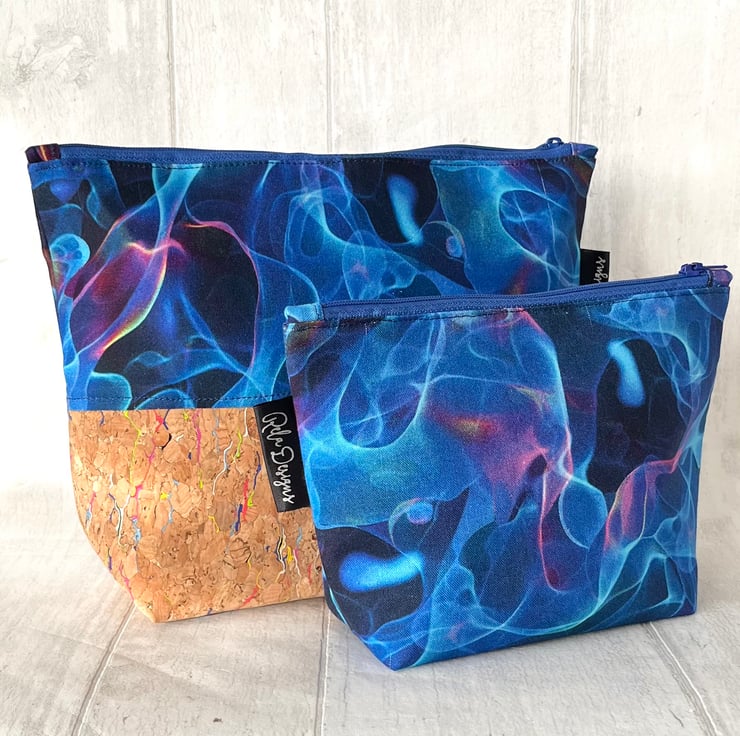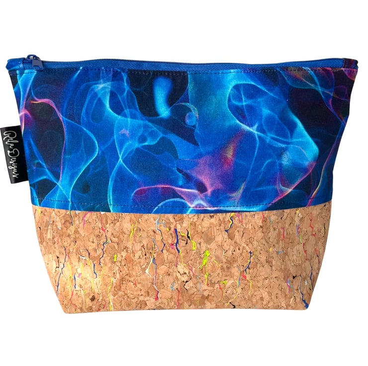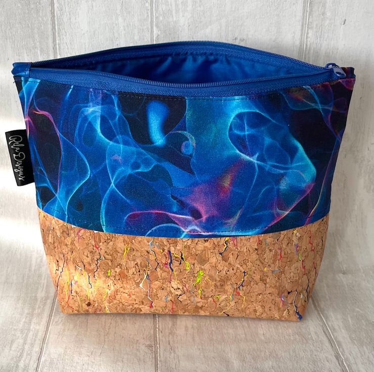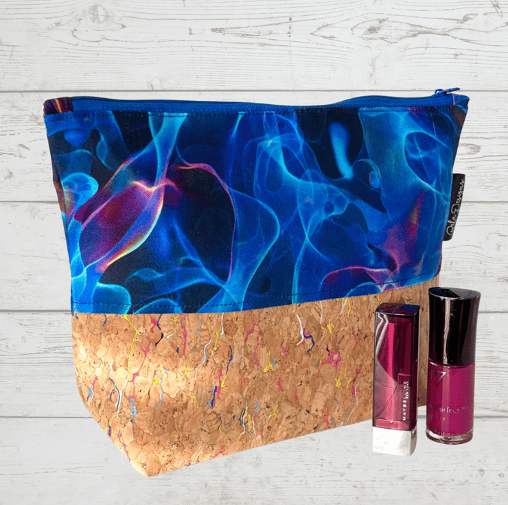 Makeup bag in colourful 100% cotton print with a cork base, lined with a purple waterproof nylon great for those inevitable spills. The cork base is also waterproof. so perfect for wet or steamy bathrooms.