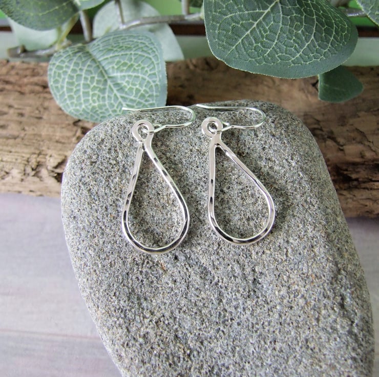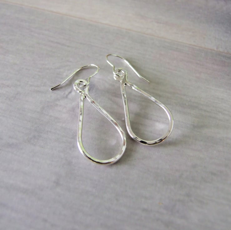 I have created the teardrop shapes from recycled sterling silver wire hand shaped and textured them with my hammer and soldered them together. Fitted to sterling silver ear wires..