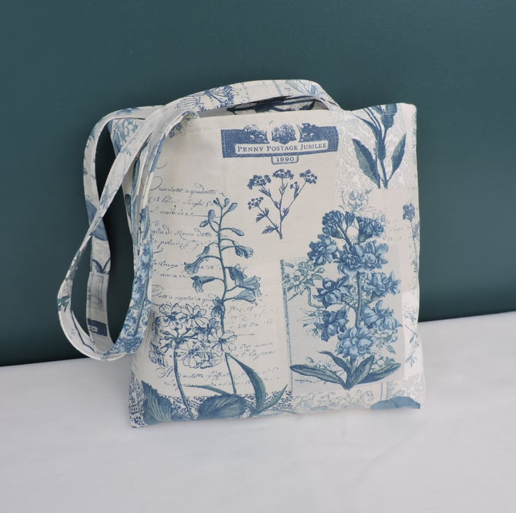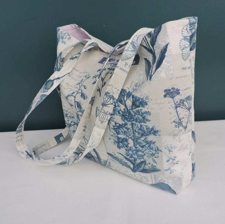 This pretty tote bag has been made with a lovely piece of reclaimed linen fabric A white background with china blue flowers. A pale lilac cotton fabric has been used for the lining. There is a squared off bottom. The bag folds easily to fit in a pocket, bag or suitcase.