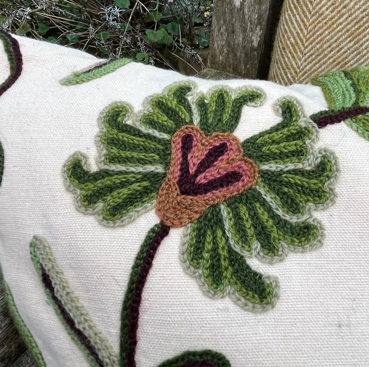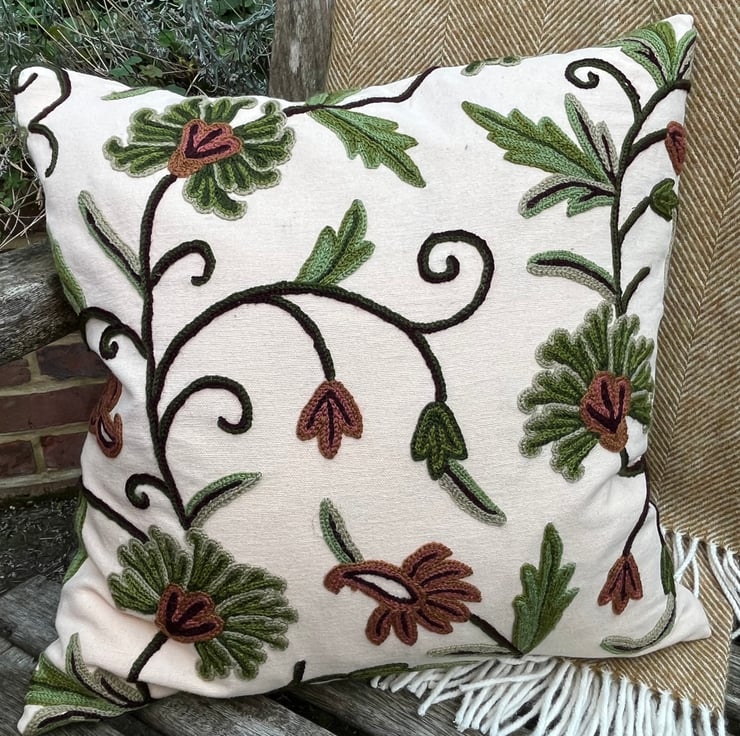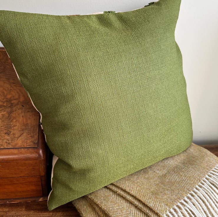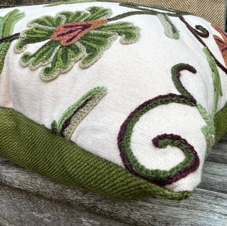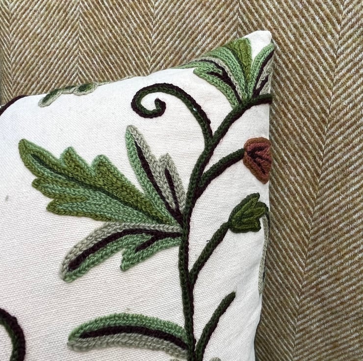 Cushion cover in crewel fabric with luxurious wool embroidery on a cream cotton background. The green of the embroidery is reflected in the green woven backing fabric.