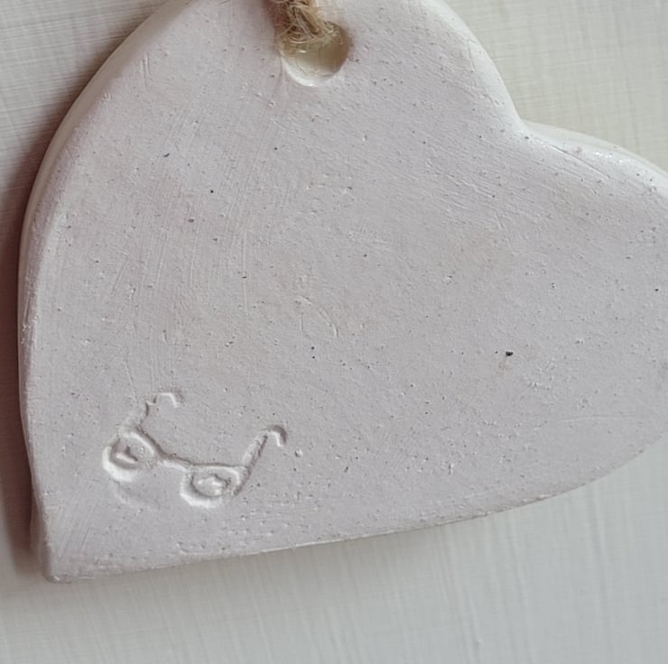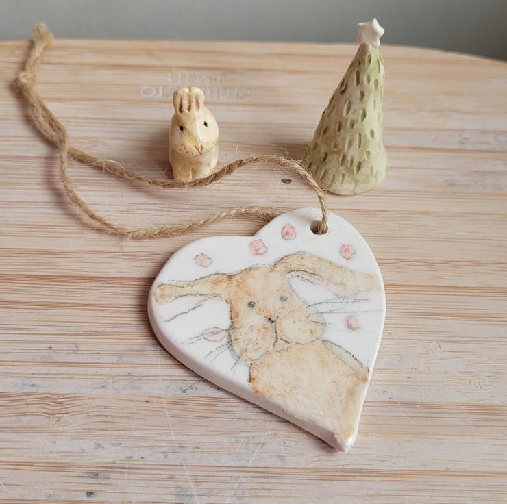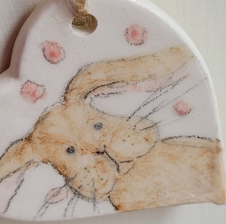 Hand made bunny rabbit hanging decoration . Handpainted with lop earred bunny face on a ceramic heart with pink dots and strung with natural twine.