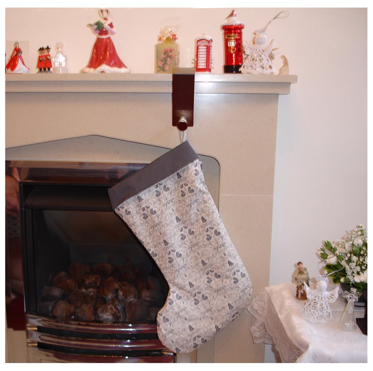 The stocking stands approx 14" (35cm) tall and has a matching loop to hang on your fireplace!