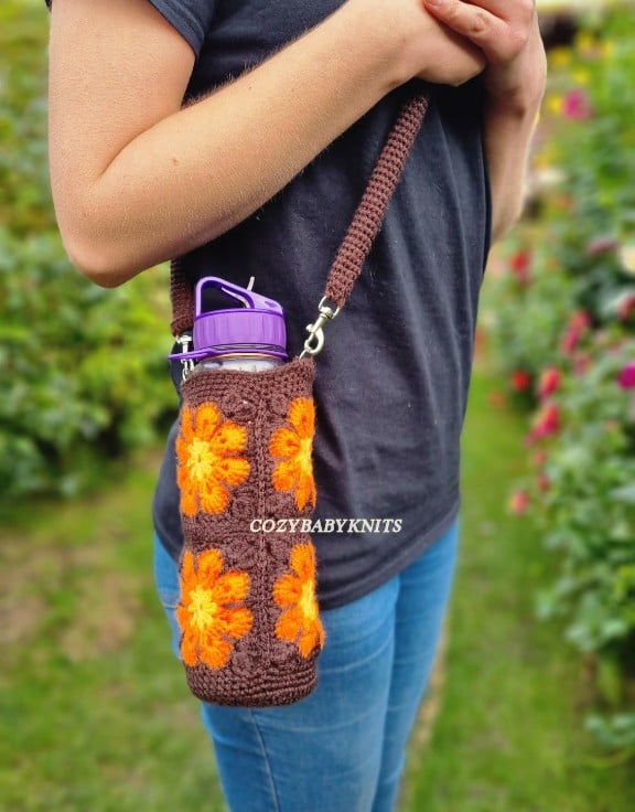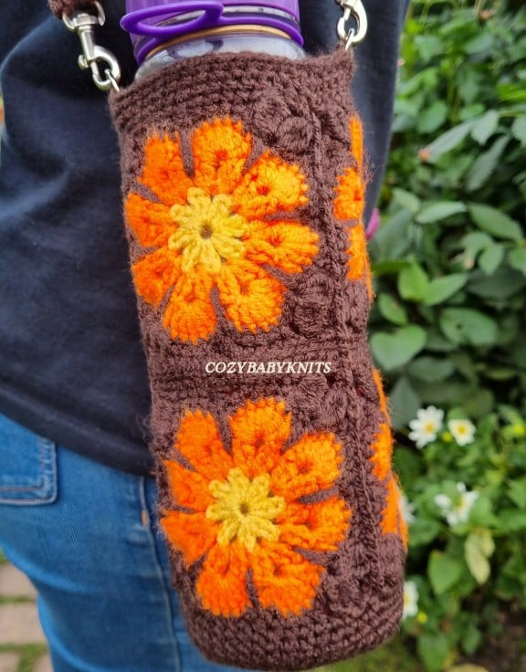 Crossbody bottle bag made with granny squares in dark brown and bright orange flowers with removable strap.