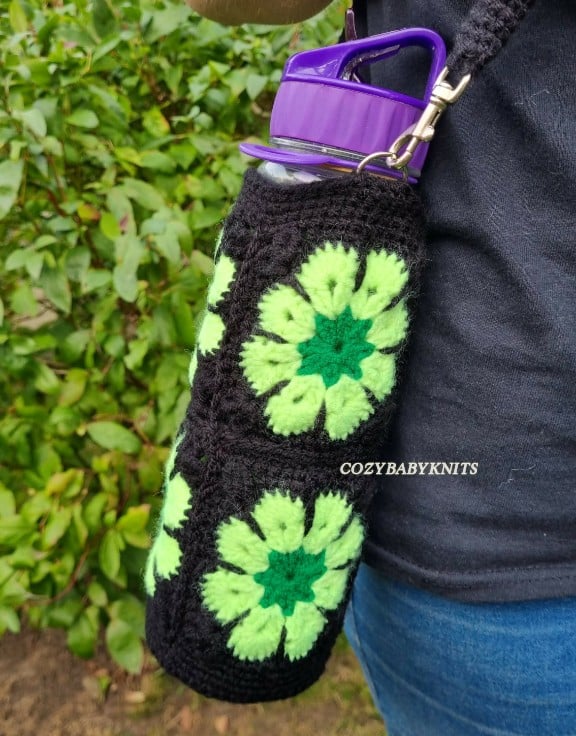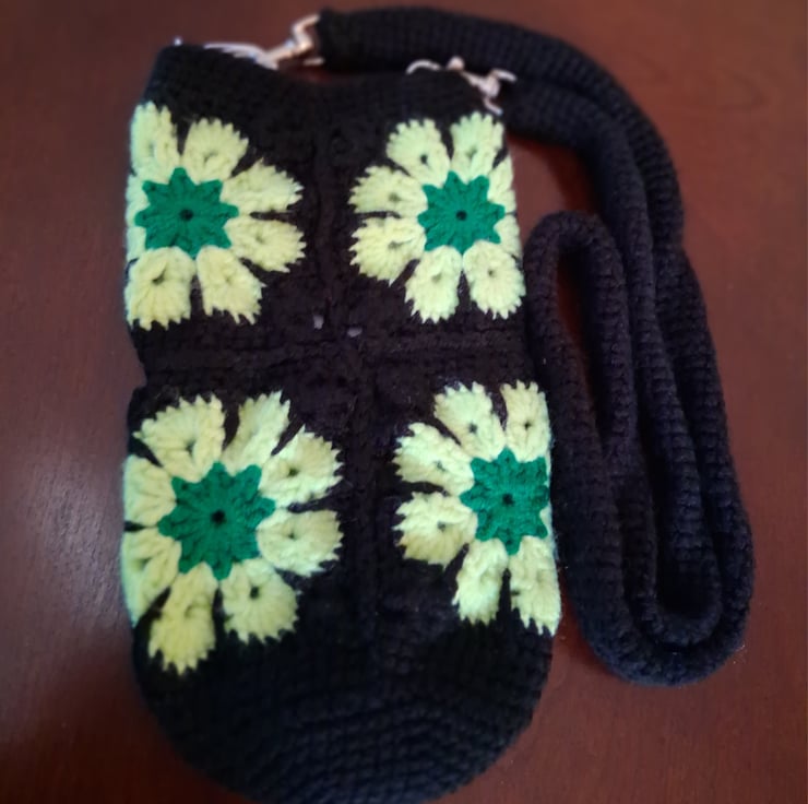 Crossbody bottle bag made with granny squares in black and bright green flowers with removable strap.
