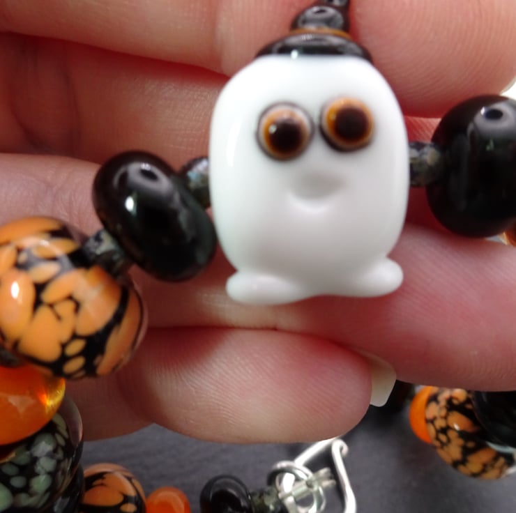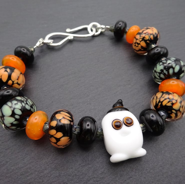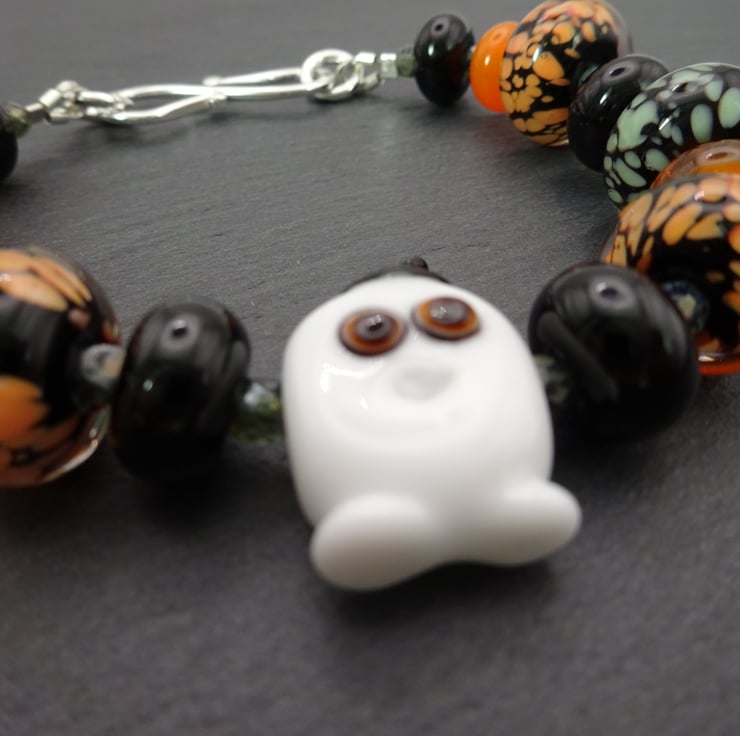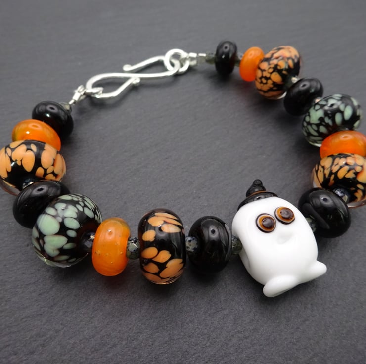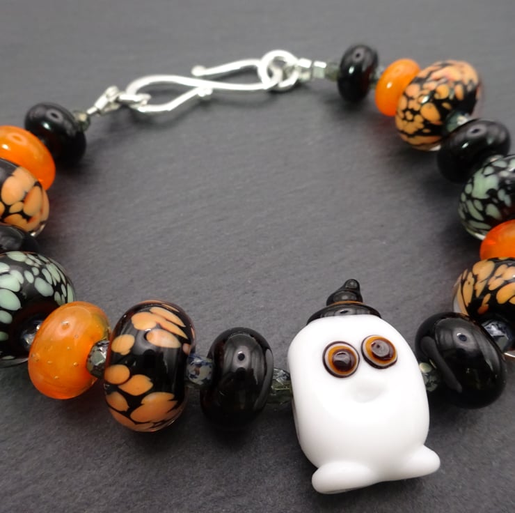 The bracelet features one of my handmade ghoul beads which has been made with white glass and is wearing a black witch's hat.