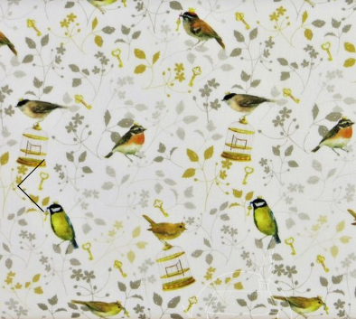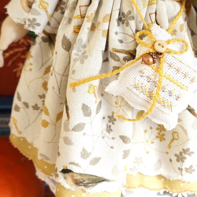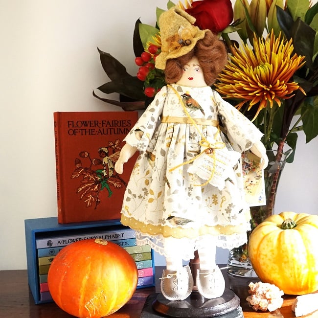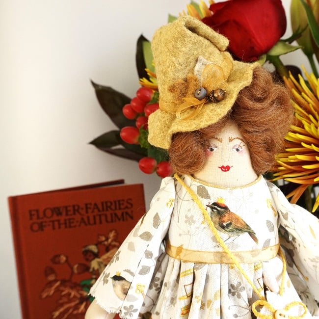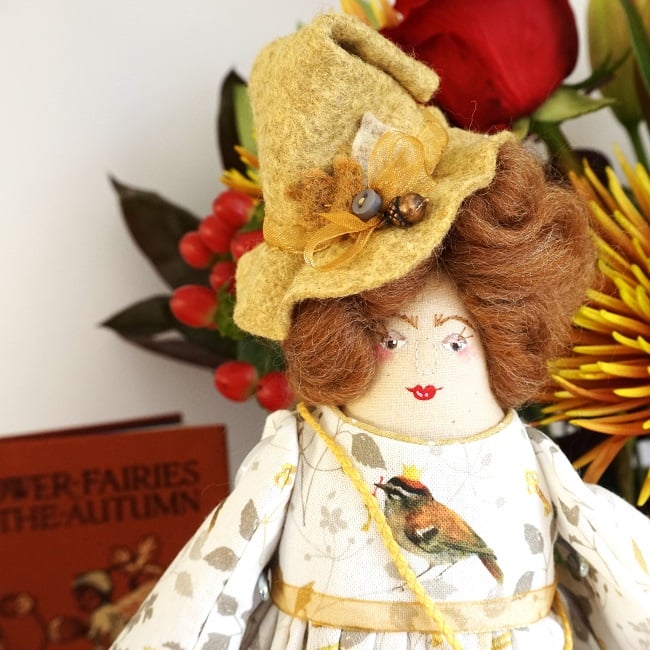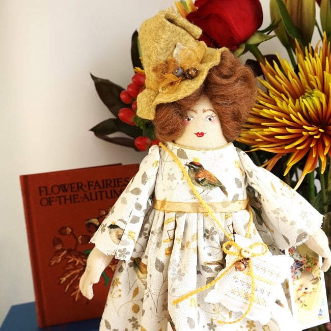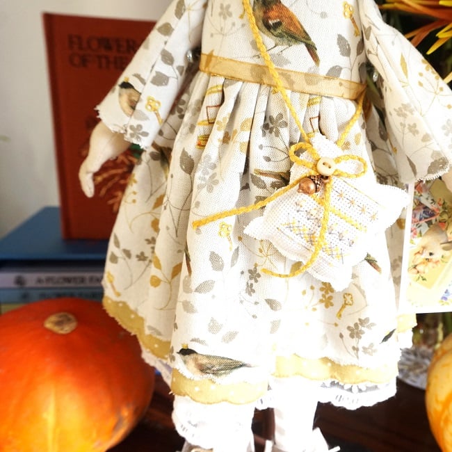 She is dressed in an Acufactum print called Bird Prince in delicate off white with little birds, tiny crowns and keys in greys and golden yellow. Her outfit is completed with tiny buttons, leather shoes and a little sampler on her little sachet. She has co-ordinating knickers and underskirts in cotton and lace. She has a little copper acorn on her hat.