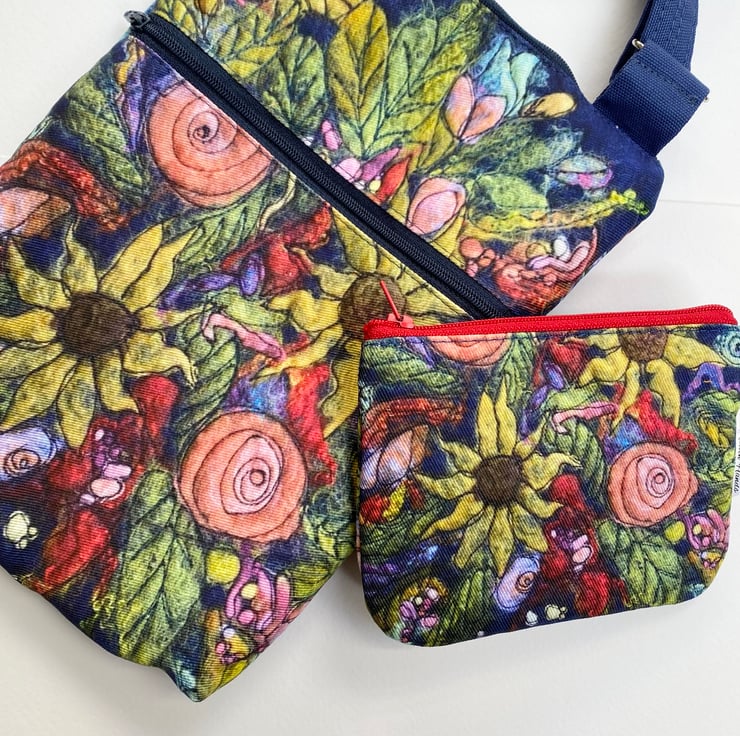 This highly versatile gorgeous zip bag is decorated with a print of one of my flower wet feltings. This one shows roses and sunflowers. It’s lined with a cotton lining and has a matching coloured zip. The print is on the front and back.