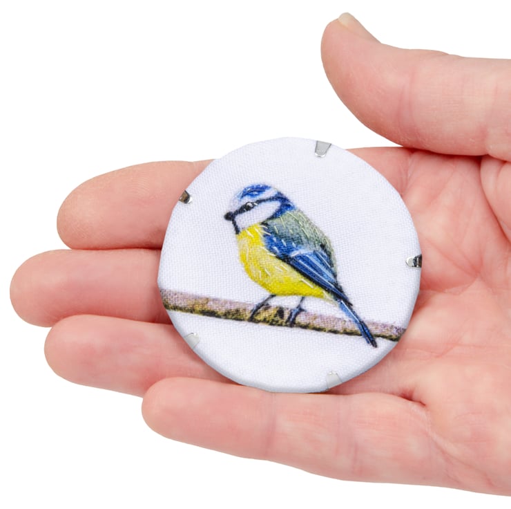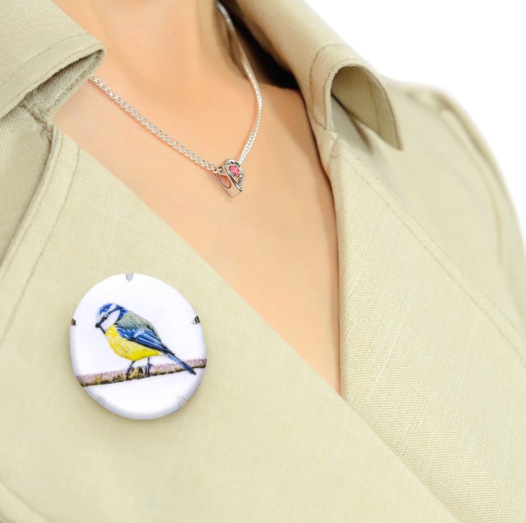 I make fabric pictures, mounted in frames of different sizes, as well as little pictures displayed in tins - and now I'm adapting some of my designs, to be little wearable pieces of fabric-art.