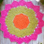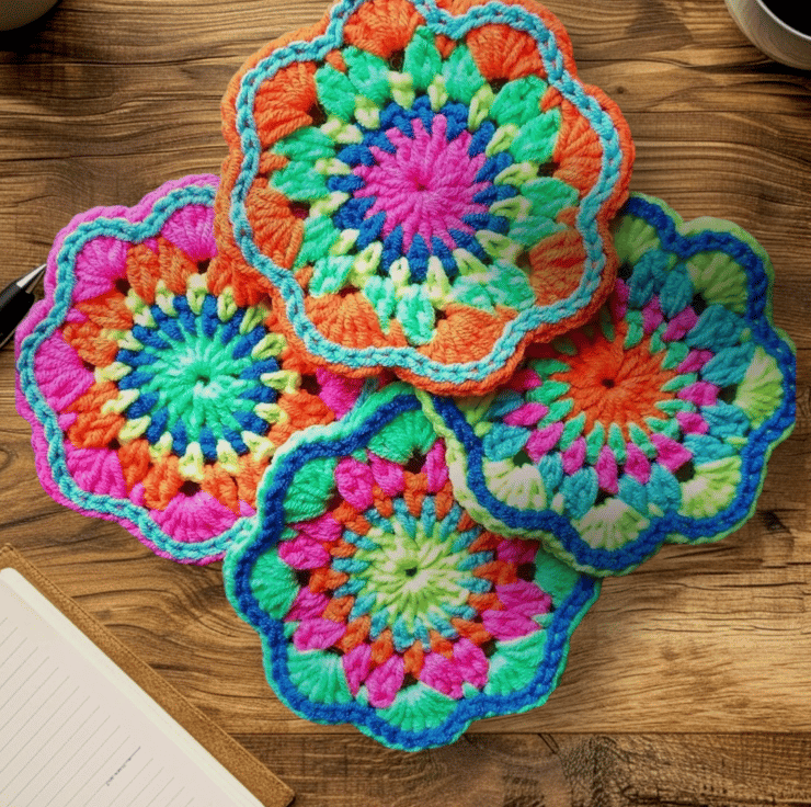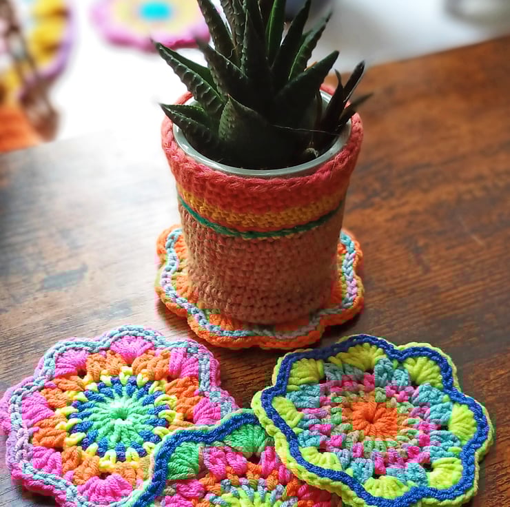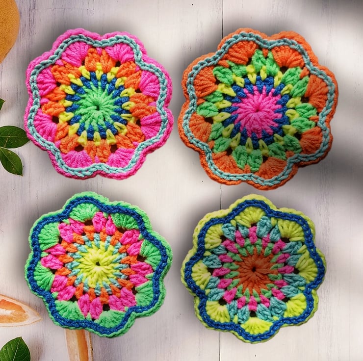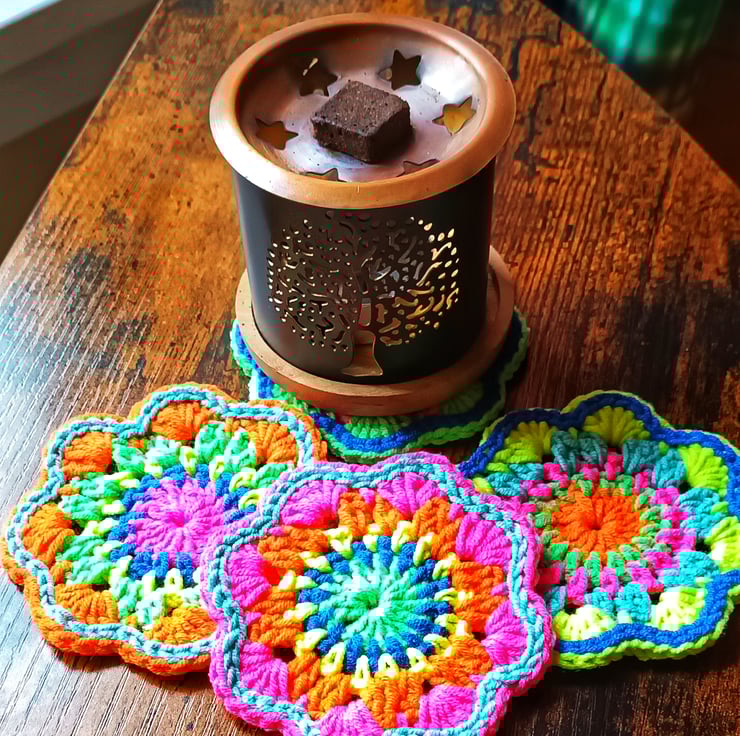 Finish off your table with this set of 4 colourful mandala flower coasters, handmade on the west coast of Scotland. These are my brightest neon. Your glasses will not stick to them like wood or plastic. Lovingly crocheted in cotton. 8.5 cm diameter.