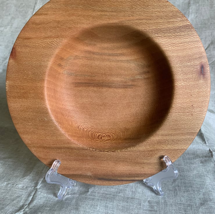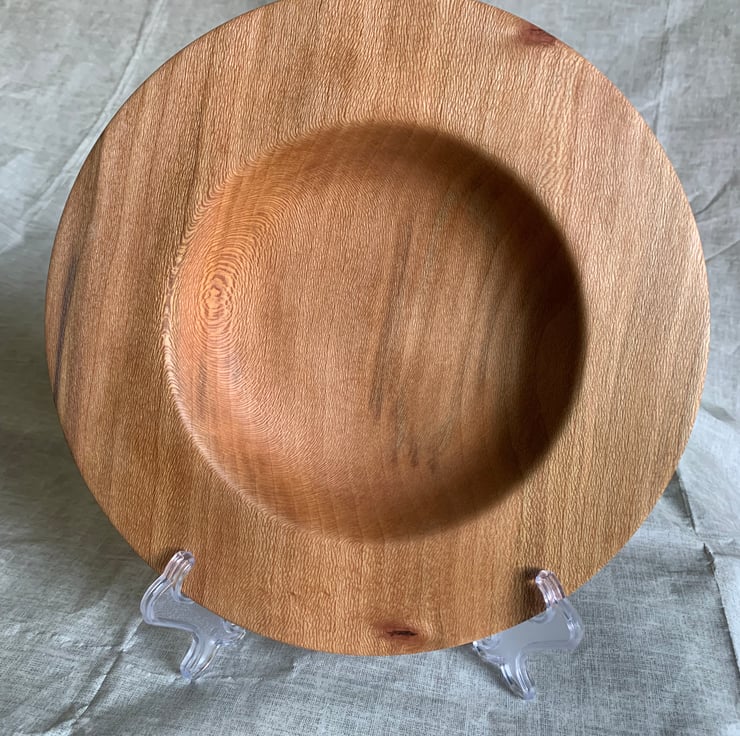 London Plane wooden shallow bowl with a wide lip. The piece has been finished with a mineral oil which is food safe. I like the satin sheen the oil gives the piece.