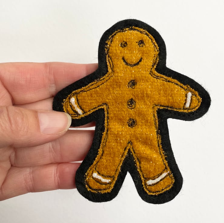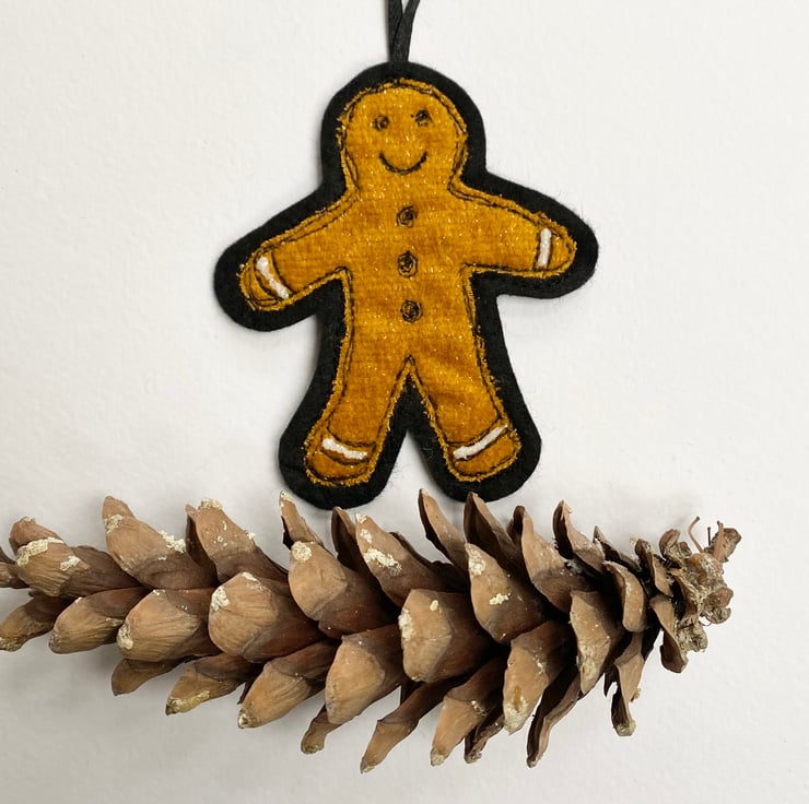 This seasonal gingerbread man Christmas tree decoration has been made from up-cycled fabrics and stitched down with free motion embroidery. It comes felt backed and measures 10 x 8cm, with the matching ribbon the length is 15.5cm approx.