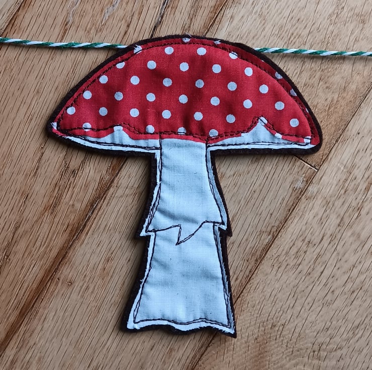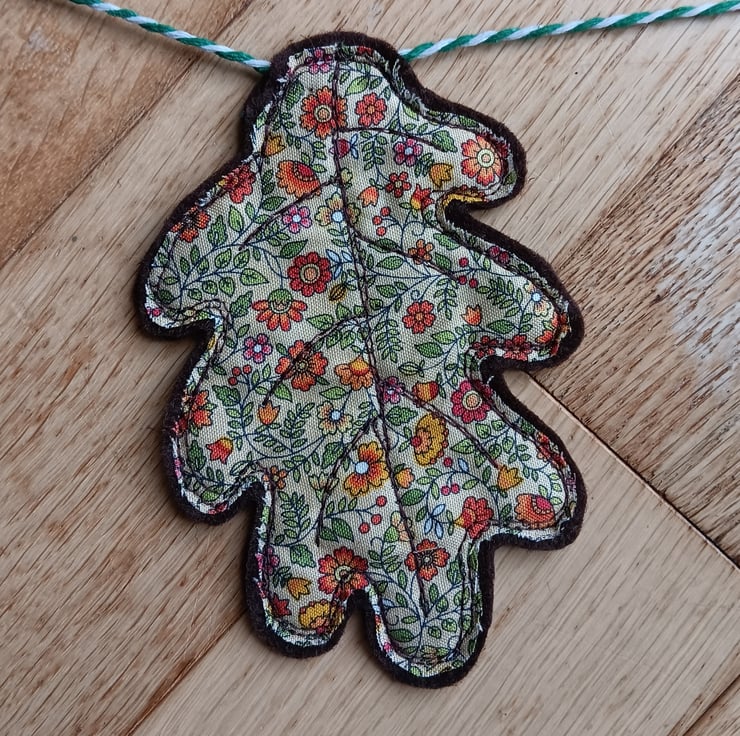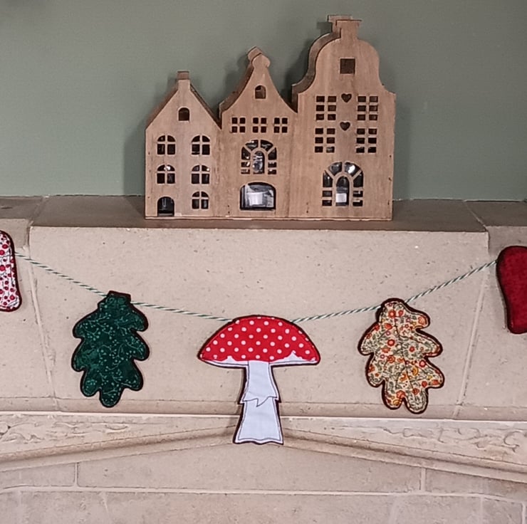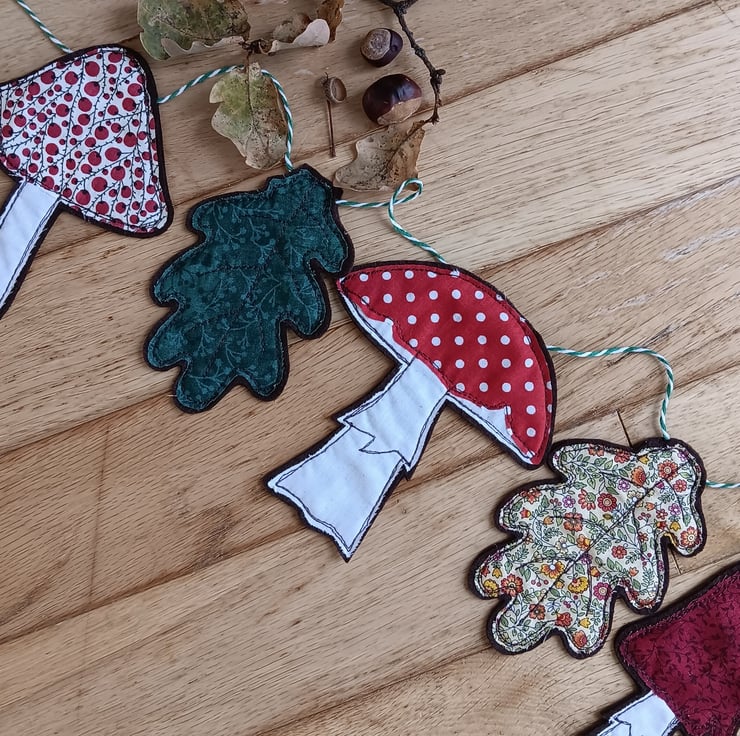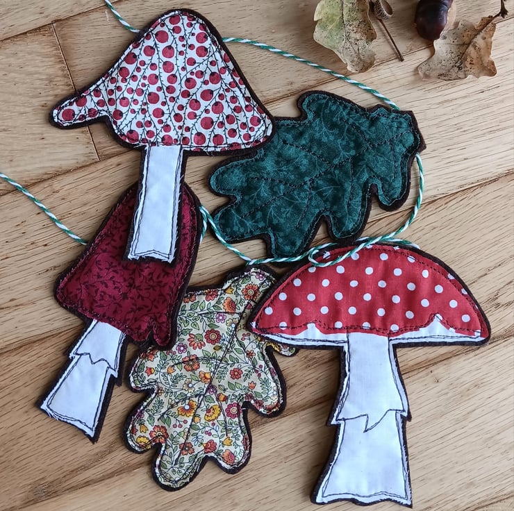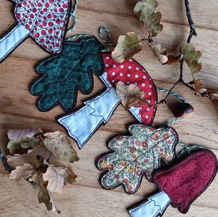 An autumnal home decoration of toadstools and oak leaves. This garland has 3 toadstools interspersed with 2 oak leaves, all hanging from a green and white stripe string. Each toadstool and leaf is made from fabric scraps and brown felt, and sewn using free motion embroidery.