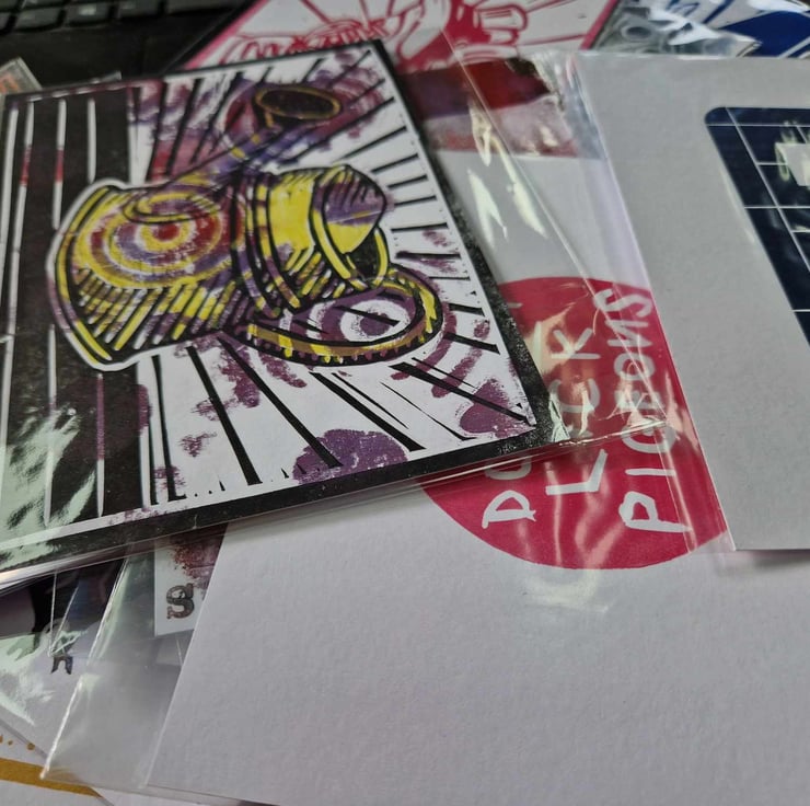 As part of an exhibition, I made 100 postcards. I wanted to experiment with lino prints I'd already made as well as using different techniques which could make fun prints.