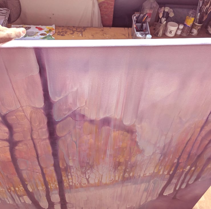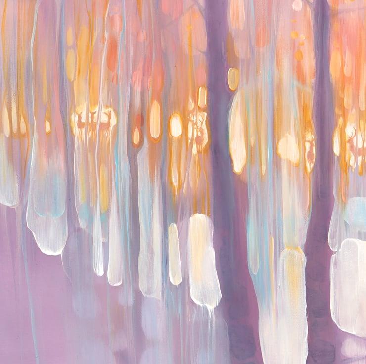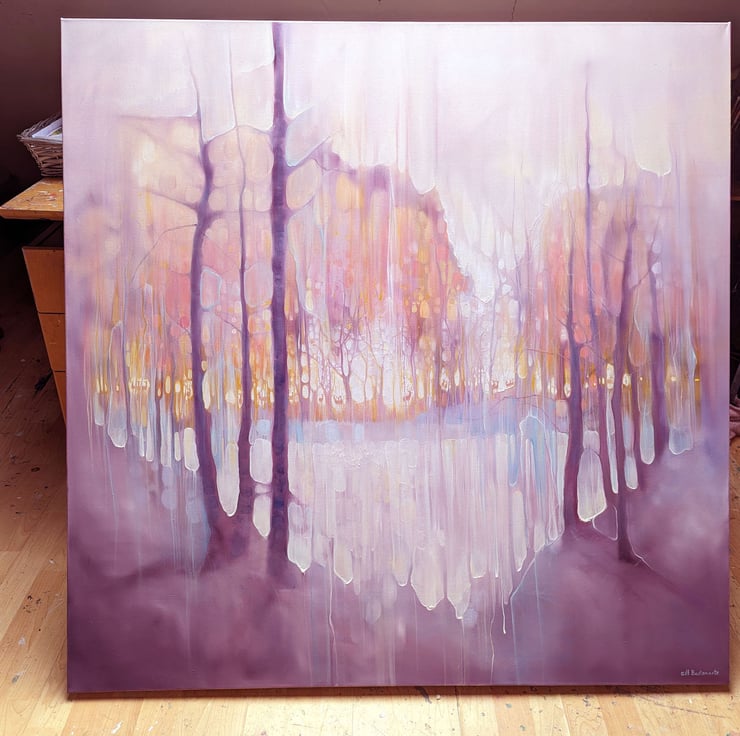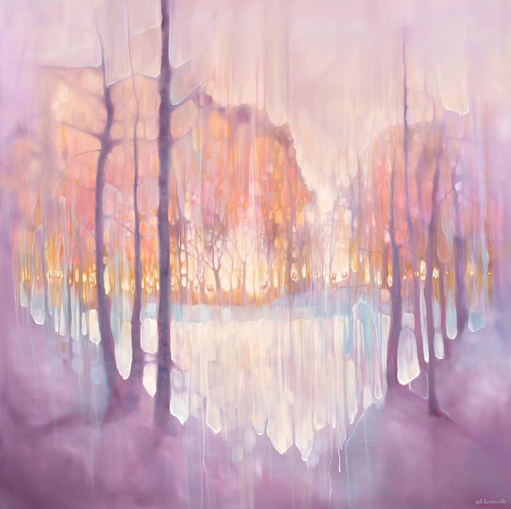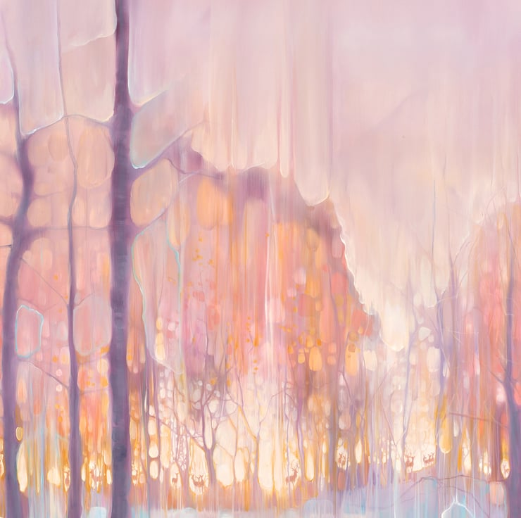 The Thin Place Beckons is a very large semi-abstract original oil painting showing deer gathering beyond a lake in a heart shaped forest at twilight. It is 48x48x1.5 inches. It was made with liberal amounts of white, golden yellow, peach and purple paint with cyan blue for accent. The inspiration was the definition of the word ‘thin place’ which is a Celtic expression for a place that stands between two universes. This is an idea I have always loved and the deer appear often in my paintings as in other folklore they are regarded as harbingers or guides between worlds. Because the paint is multilayered and oil colours do change quite dramatically in different light, (something that delighted me when I saw it in this painting), it will go from muted neutral colours to luminous sunset ones at different times of the day. Painted on deep edge canvas, wide edges, painted white, ready to hang and comes with a certificate of authenticity.