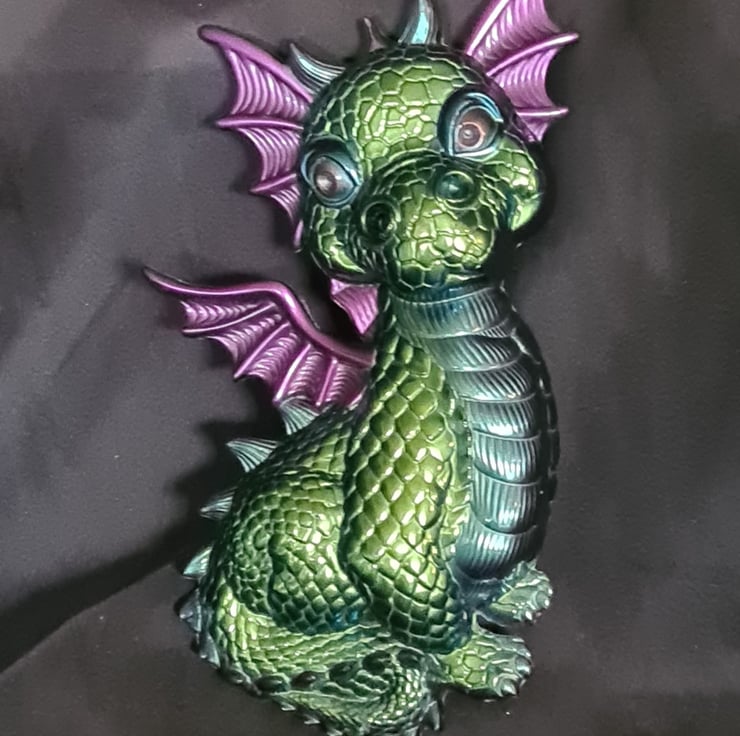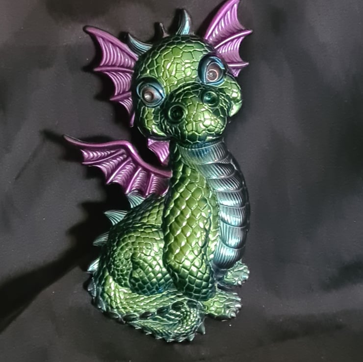 A gorgeous Baby Dragon hanging ornament. Lovely Chameleon colours of Green, Blue and Purple. Made of resin and ready to hang on your wall with its attached hook. A cute piece for Dragon fans.