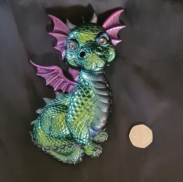 Dragon ornament measures approx 20cm H x approx 10cm at widest part. Made of epoxy resin with Chameleon powders and a hook to the back to hang on your wall. Back of dragon is flat and has a flocked purple covering.
