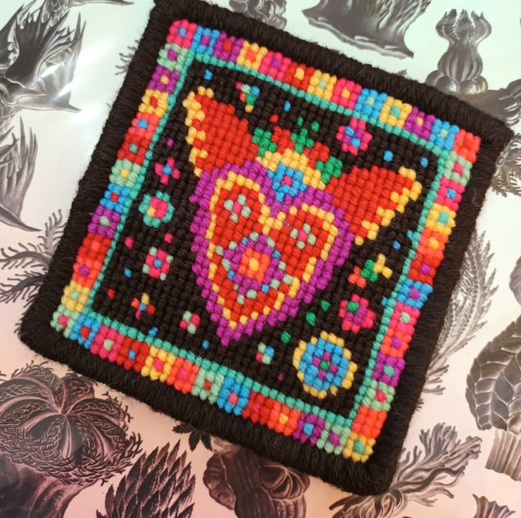 The Flaming Heart Tapestry sewn in Victorian Cross Stitch and can be made into a beautiful picture, small hanging, bag front or cute pin cushion.