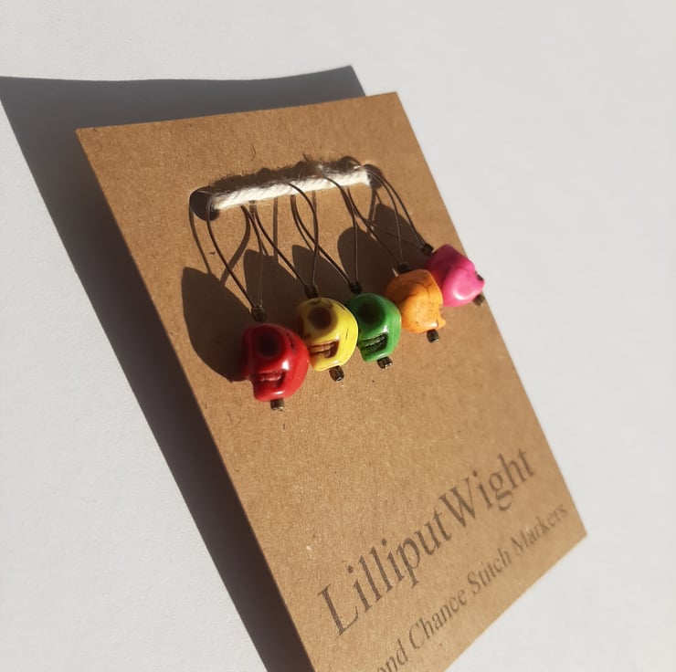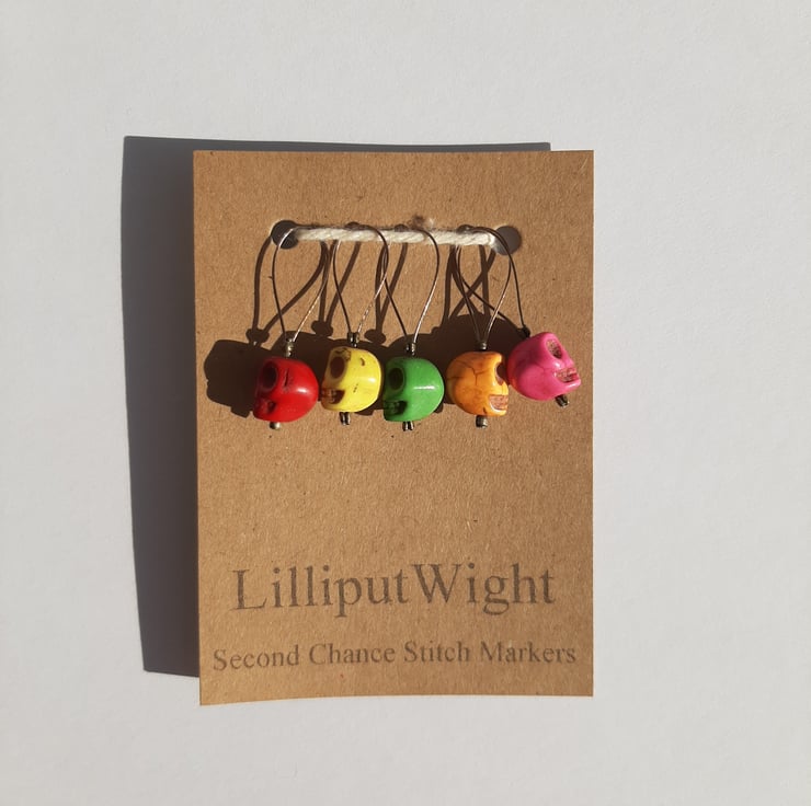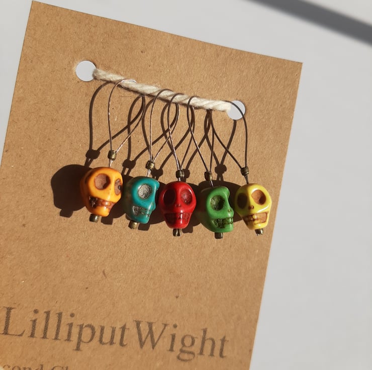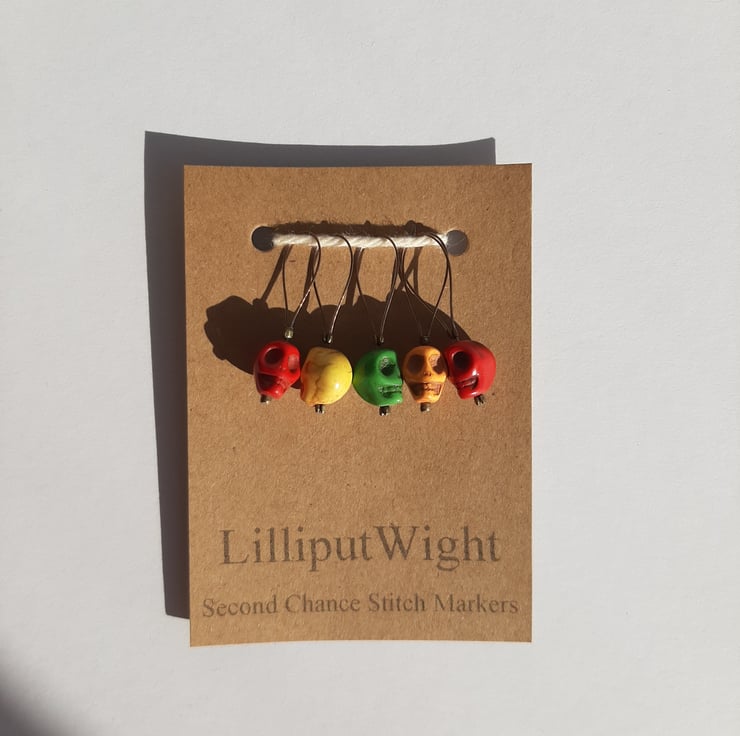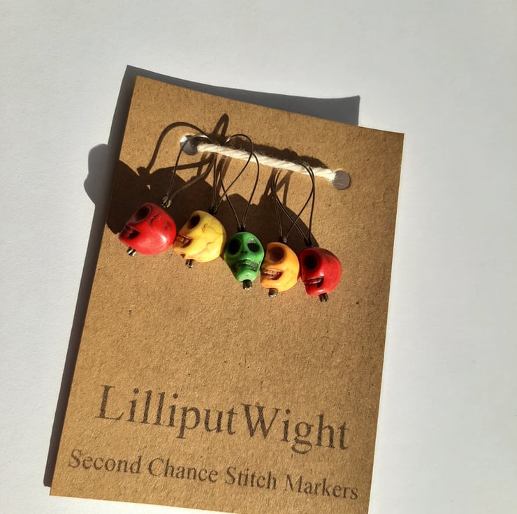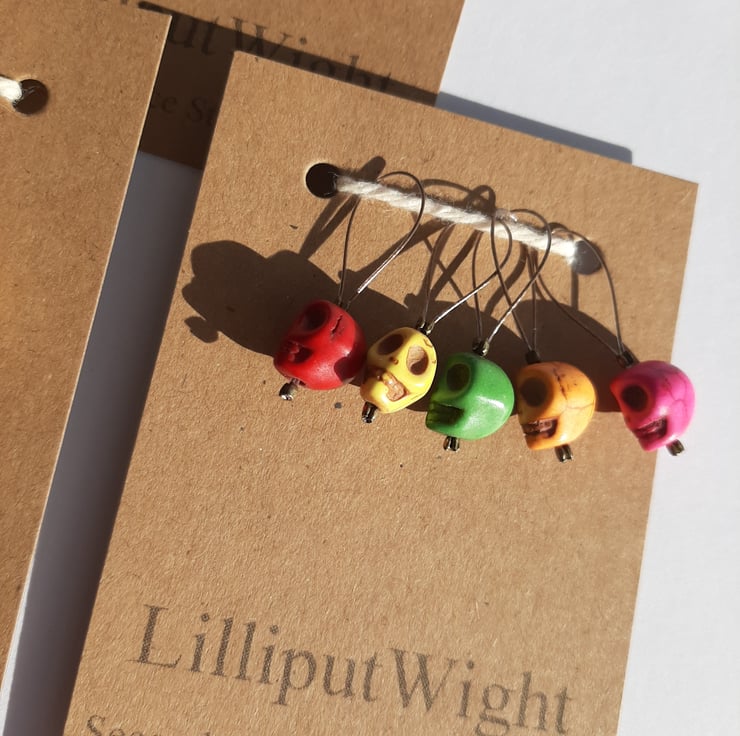 In a past life I worked as a stage manager. Clearing out my theatre things I found these skull beads left over from a production of Hamlet. Now these tiny colourful Yoriks have been given a new lease of life as these limited edition stitch marker sets.