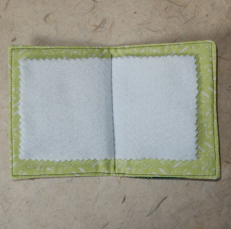 This needle case features a cute brown spotted deer standing in the woods. It is made from cotton fabrics with the deer appliqued on. The case measures approx. 4.5 x 3 inches , and it is lined in toning cotton fabric and it has four felt leaves for your pins and needles.