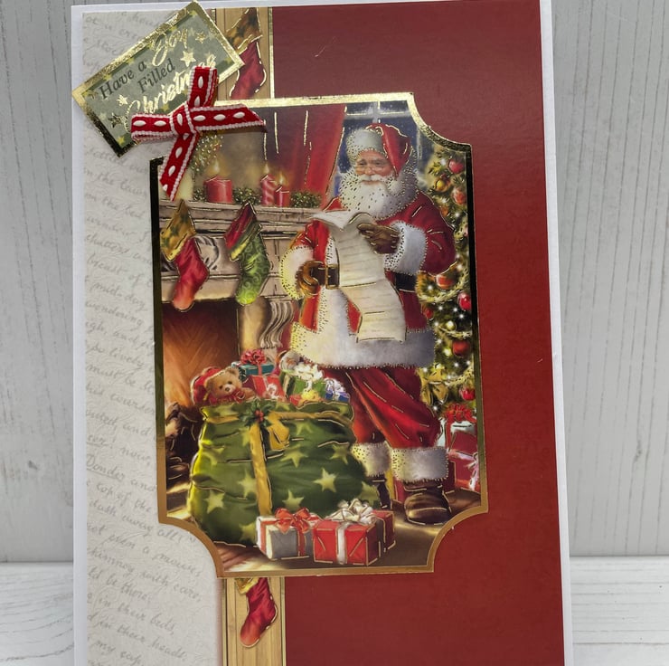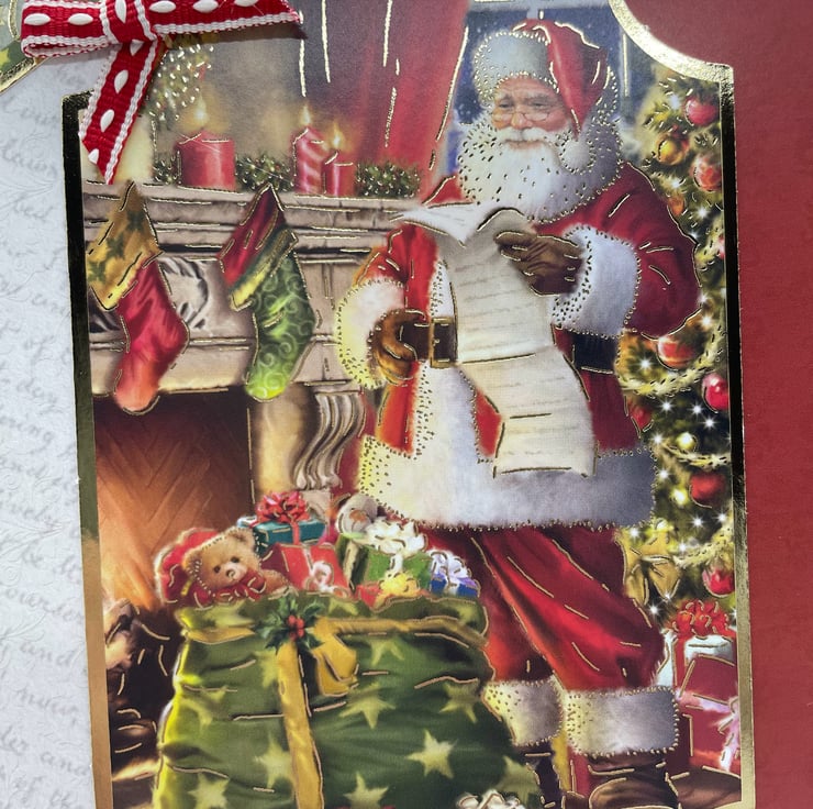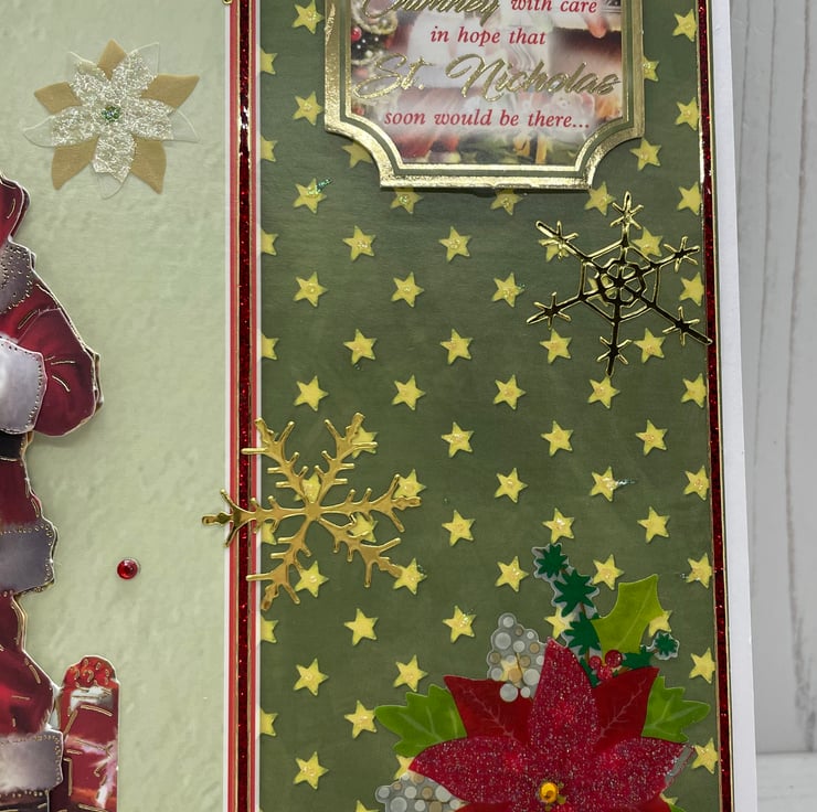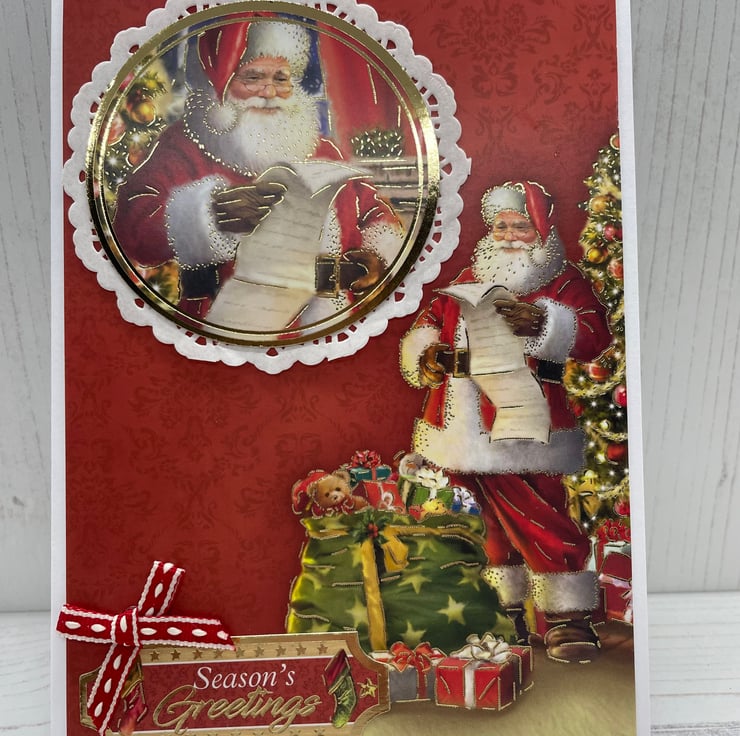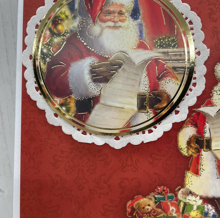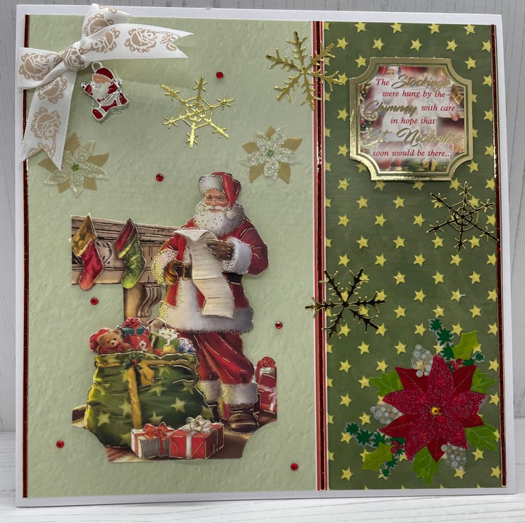 Card 1 is 8” x 8” with a 3D decoupage Santa, embellished with glitter stickers, snowflakes and more. An enamel Santa charms and ribbon to complete.