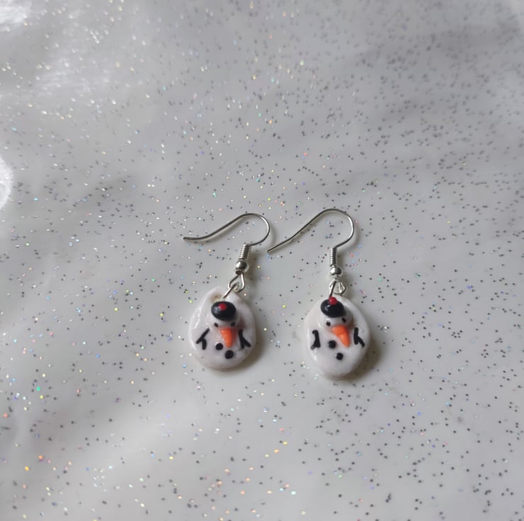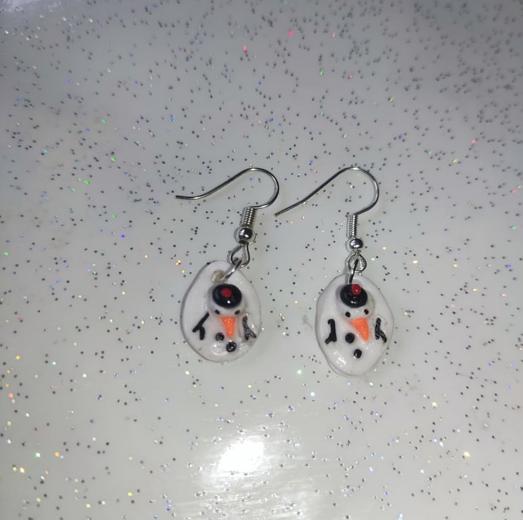 Each earring measures approximately 1cm across and 1.5cm from top to bottom of the snowman, the earring wire means that these earrings have a drop of 4cm from ear to the bottom of the snowman