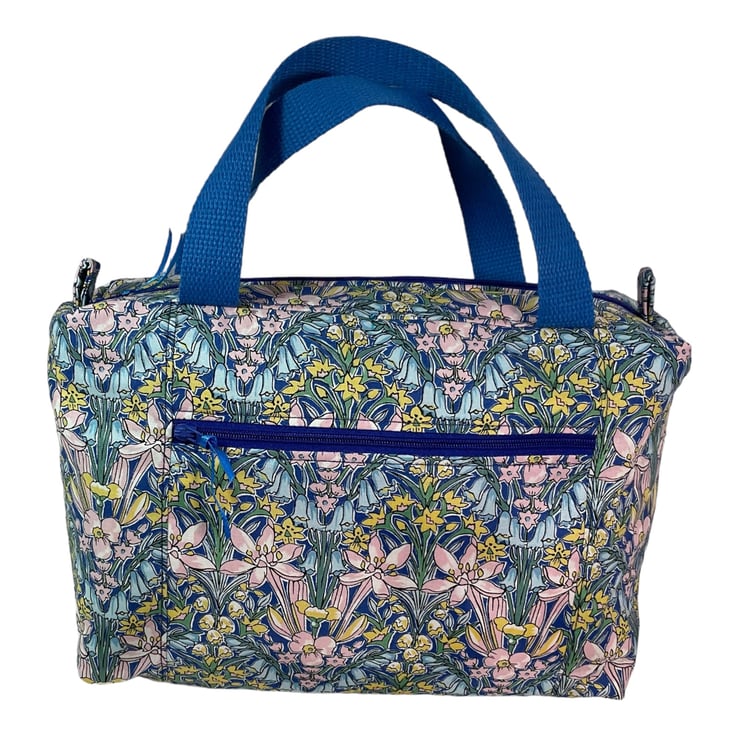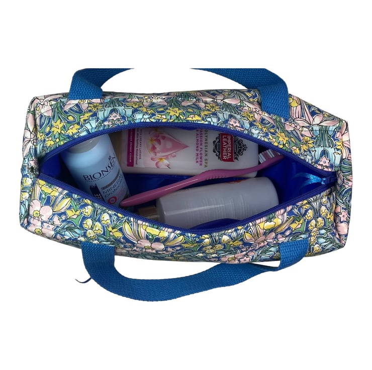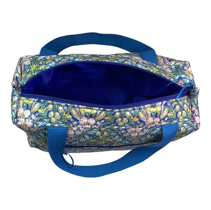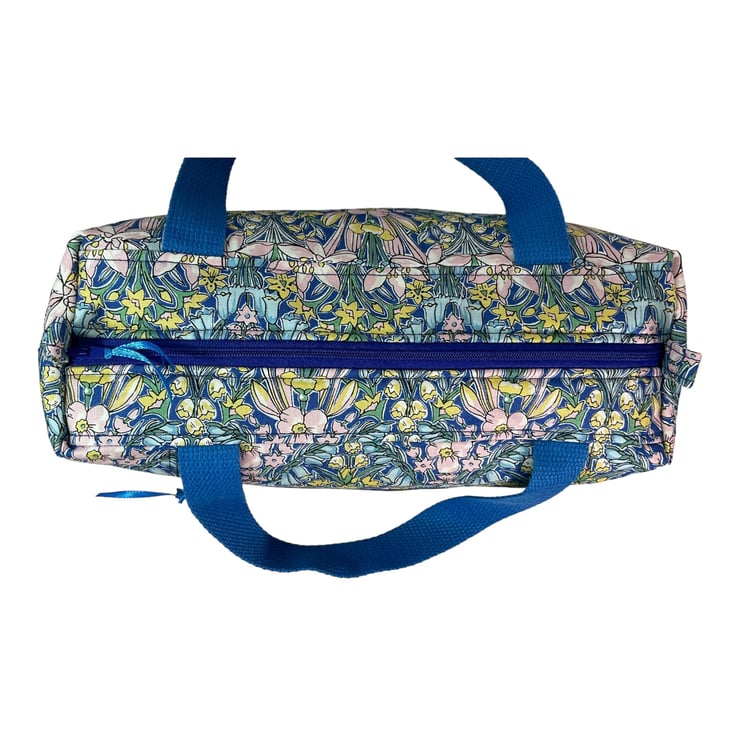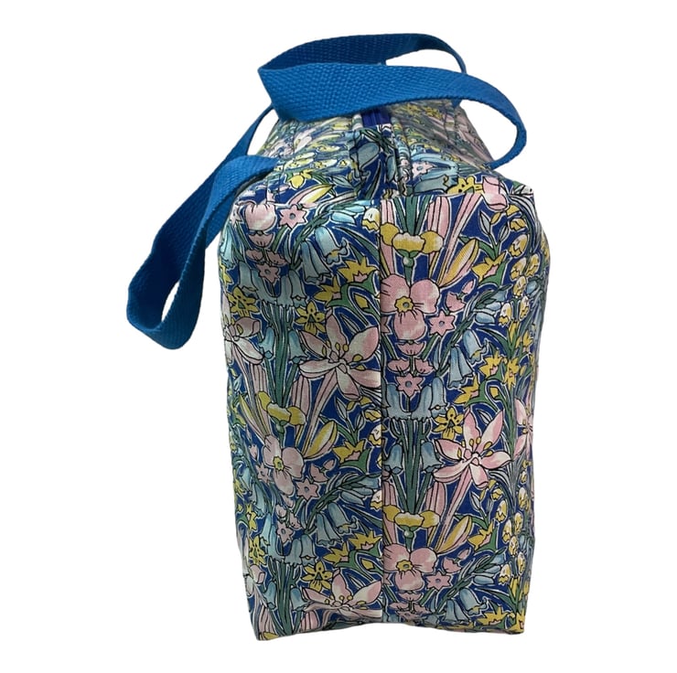 This large boxed bag is made from Liberty’s Lasenby cotton fabric, a quality hard wearing fabric “Adlington Hall ” print is the focus of this toiletries bag, with its pretty art deco style floral print on a royal blue background. The bag is a large sized washbag that would work equally well as a very large cosmetics bag, or for many other uses. I have filled the bag with full size toiletries and there is still plenty of space left.